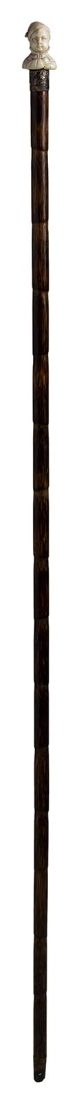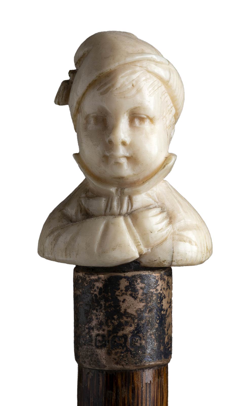 impugnatura in avorio di elefante scolpita con testa di fanciullo. Asta in bamboo, collarino in argento 925/1000 punzonato Birmingham 1906-07 e puntale in metallo. Peso 123 gr, altezza 90 cm. Stato di conservazione: **** buono. Certificato di Antichità Ce.S.Ar. (pre-1947).