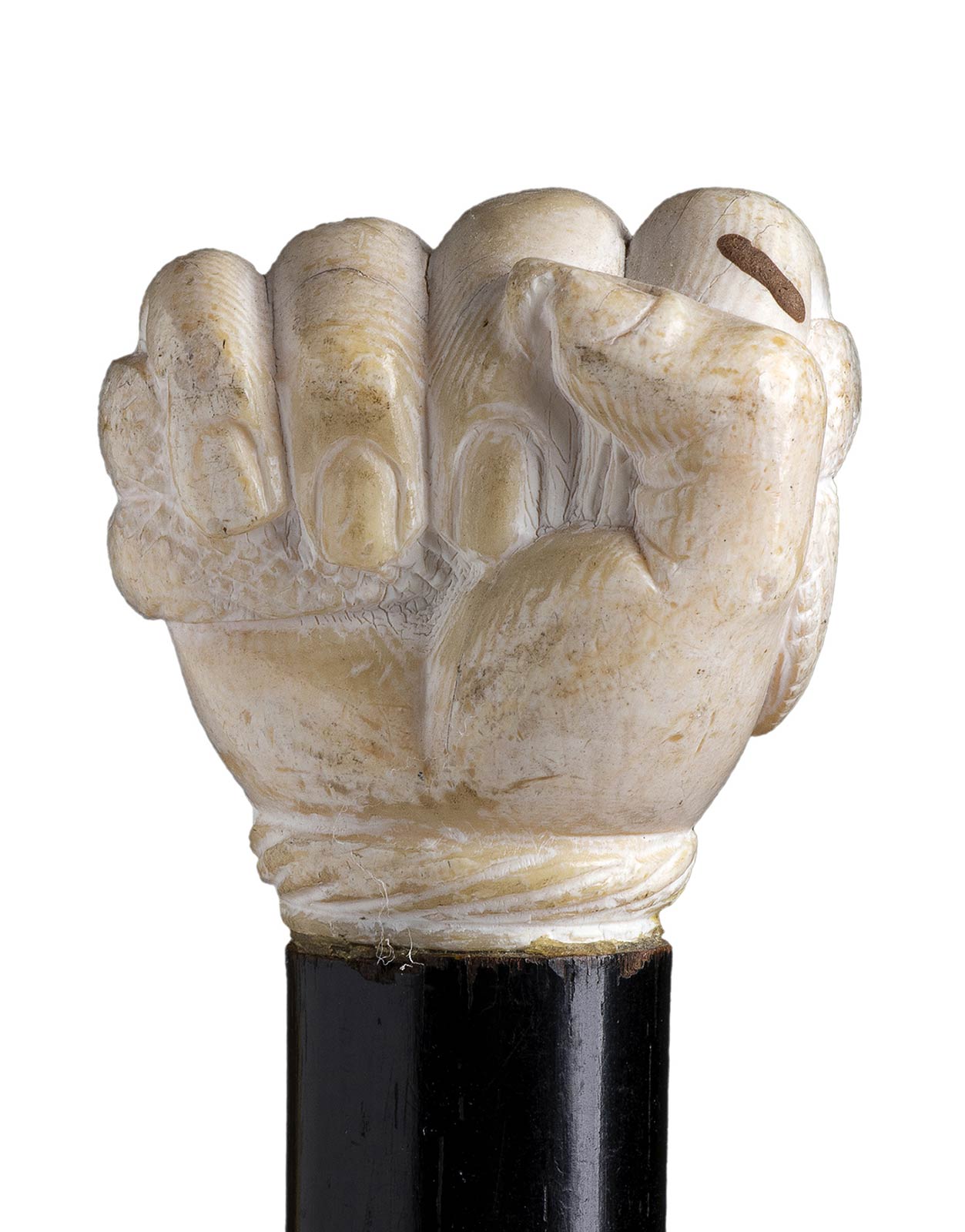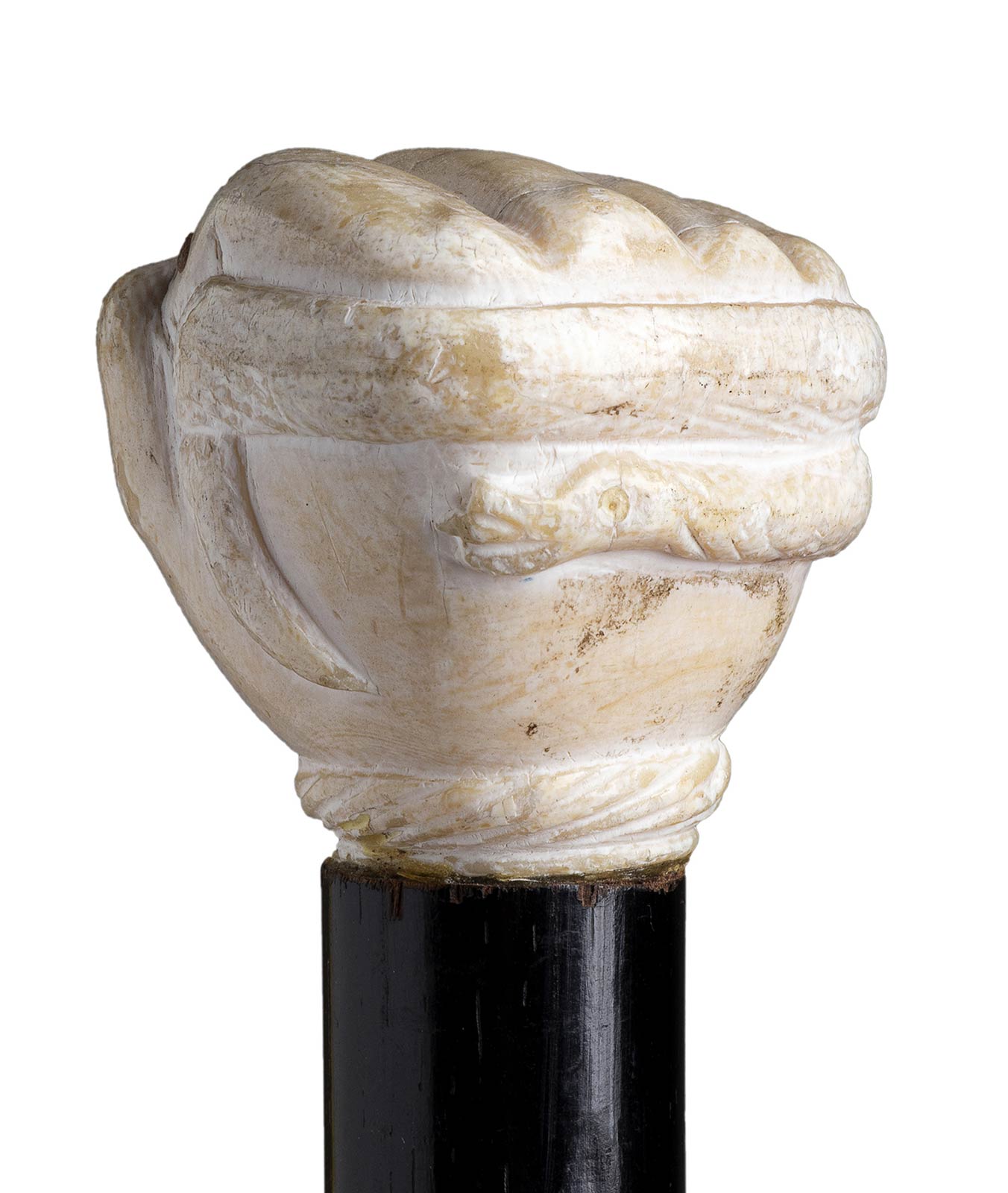 impugnatura a pomolo in avorio di elefante scolpita con una mano destra che tiene serpente. Asta in legno ebanizzato e puntale in metallo. Peso 244 gr, altezza 89 cm. Stato di conservazione: **** buono. Certificato di Antichità Ce.S.Ar. (pre-1947).