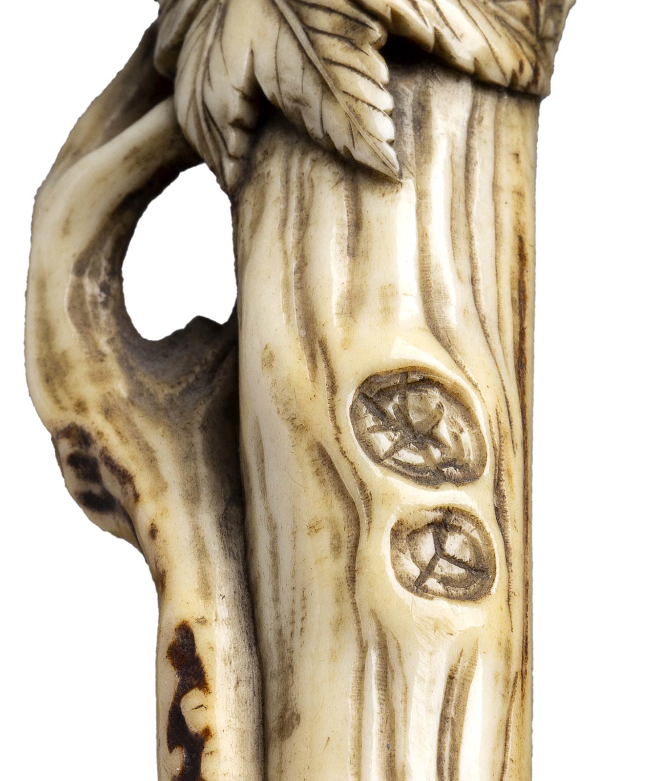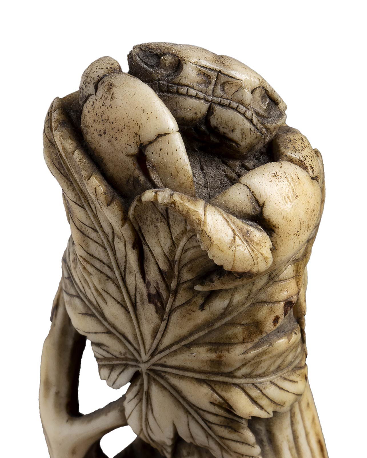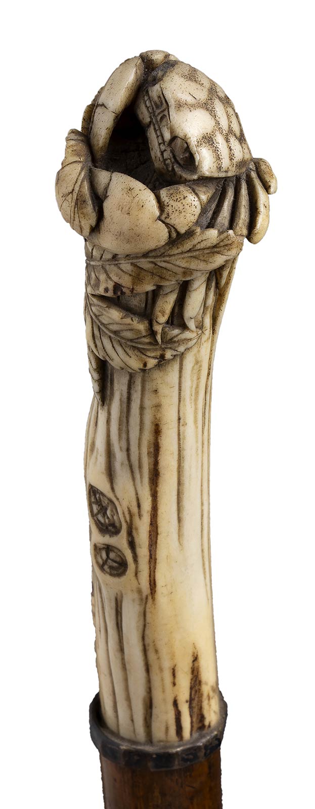 impugnatura giapponese verticale in osso scolpita con granchio posto su un tronco d'albero. Asta in legno, collarino in metallo. Peso 181 gr, altezza 88 cm. Stato di conservazione: **** quasi buono (puntale assente).