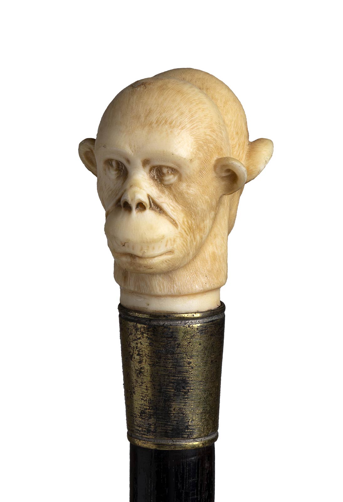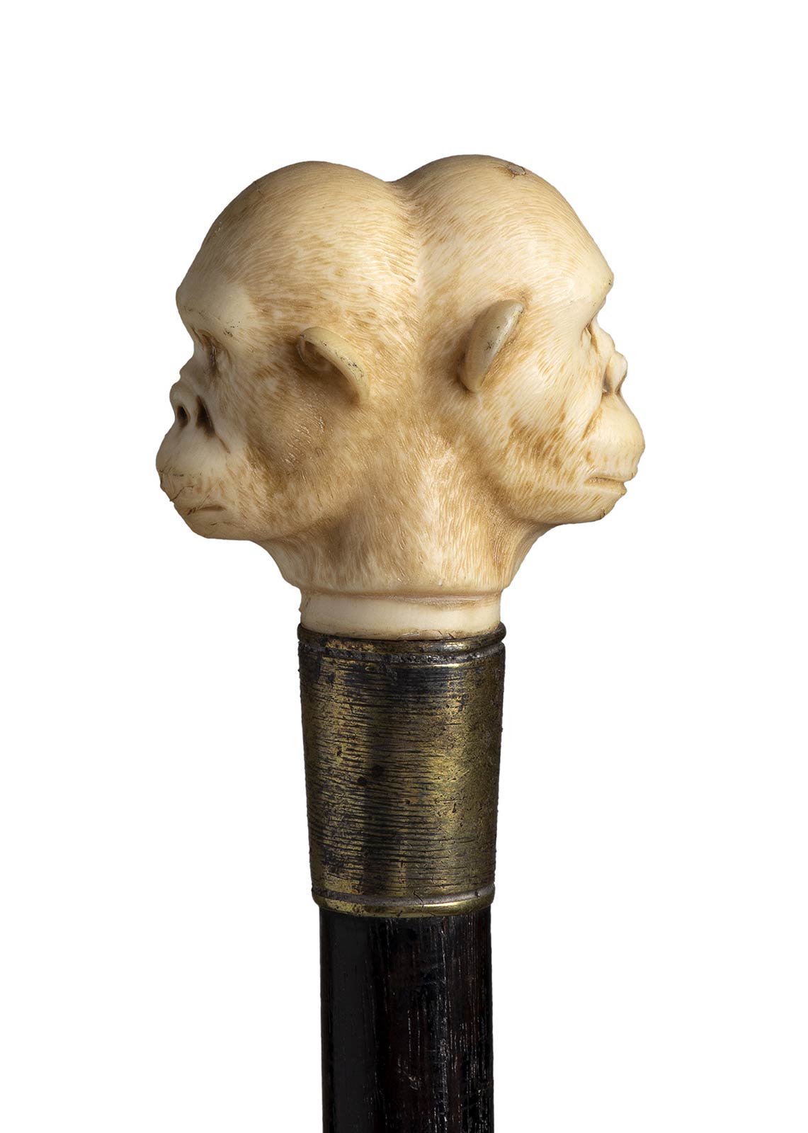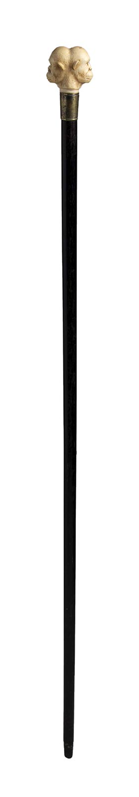 impugnatura verticale in avorio di elefante scolpita con due teste di macaco contrapposte. Asta in ebano, collarino in metallo dorato liscio. Peso 241 gr, altezza 83 cm. Stato di conservazione: **** quasi buono (puntale assente). Certificato di Antichità Ce.S.Ar. (pre-1947).