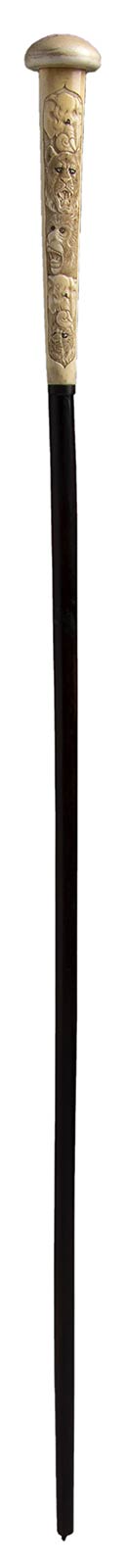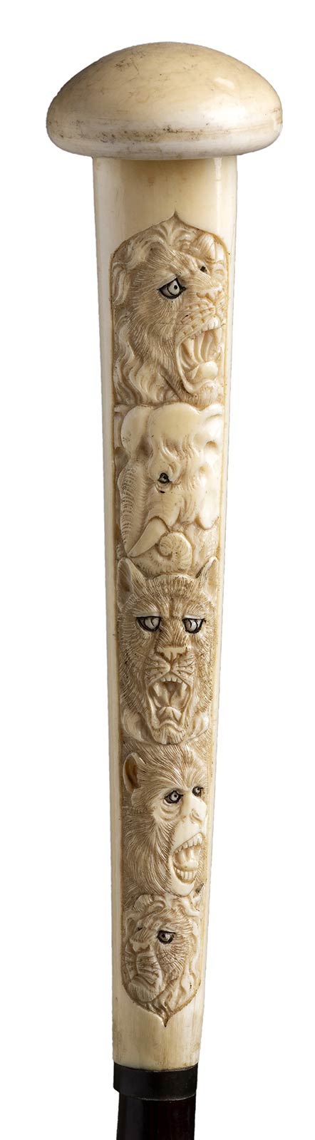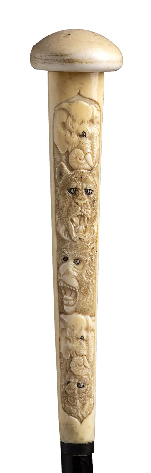 impugnatura giapponese verticale in avorio di elefante scolpita con teste di tigre, di elefante e di scimmia. Asta in legno scuro, collarino in metallo liscio. Peso 192 gr, altezza 84,5 cm. Stato di conservazione: **** quasi buono (puntale assente). Certificato di Antichità Ce.S.Ar. (pre-1947)