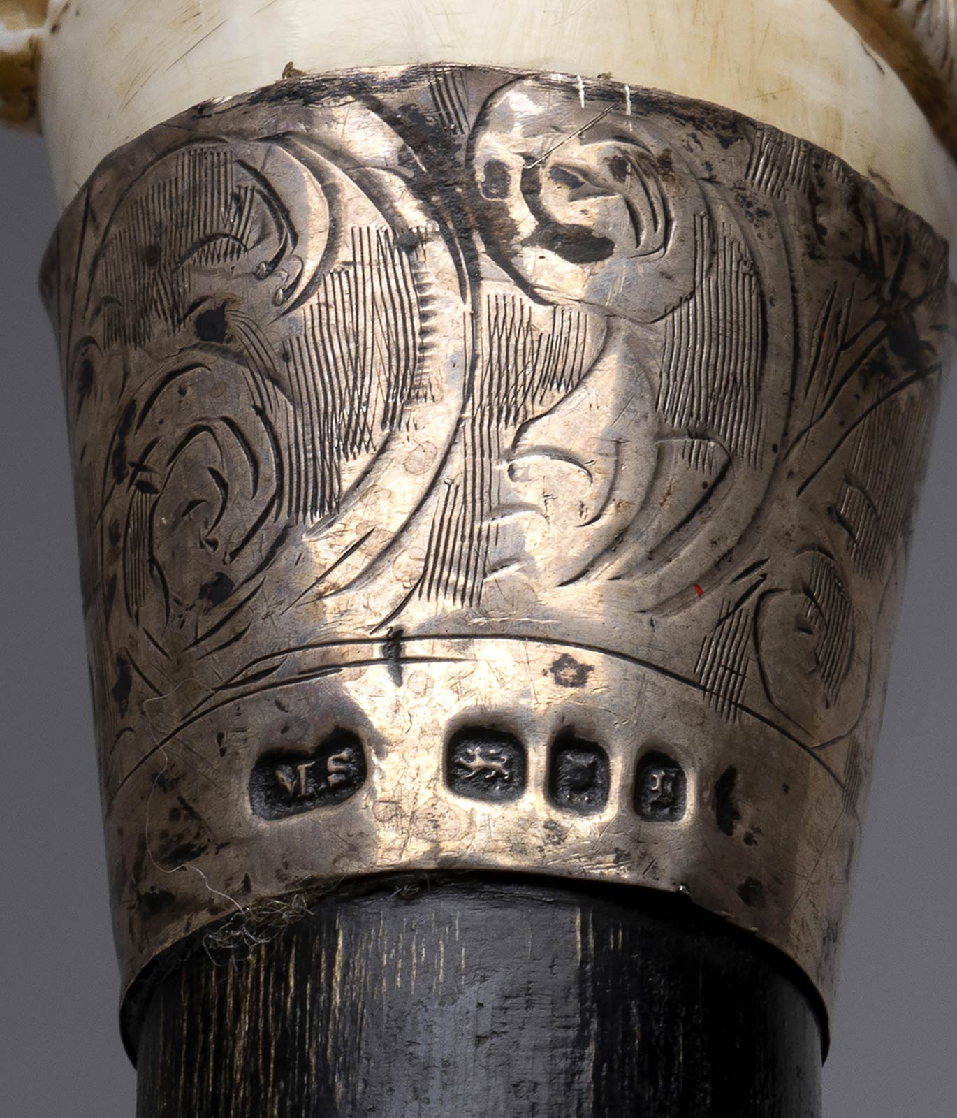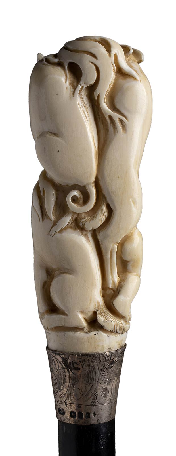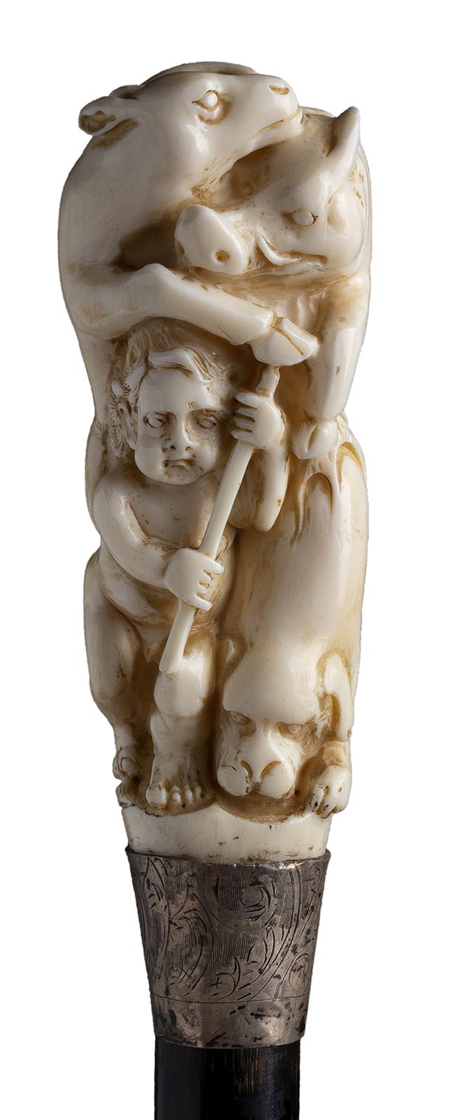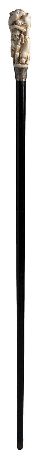 impugnatura verticale in avorio di elefante scolpita con putto, cinghiale, cane ed orso. Asta in legno ebanizzato, collarino in argento 925/1000 con decori floreali punzonato Londra 1922-23 e puntale in metallo. Peso 271 gr, altezza 95 cm. Stato di conservazione: **** buono. Certificato di Antichità Ce.S.Ar. (pre-1947).