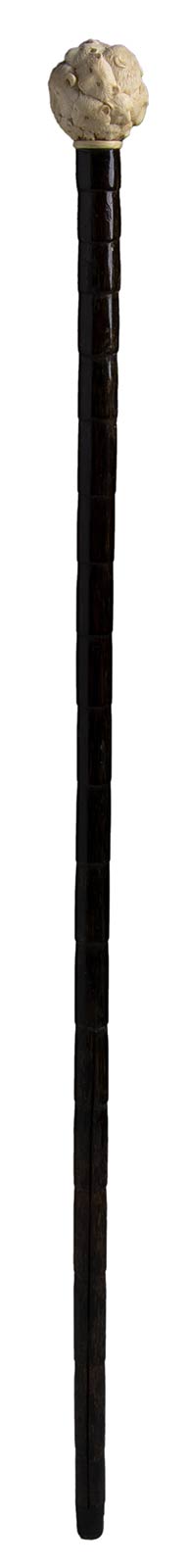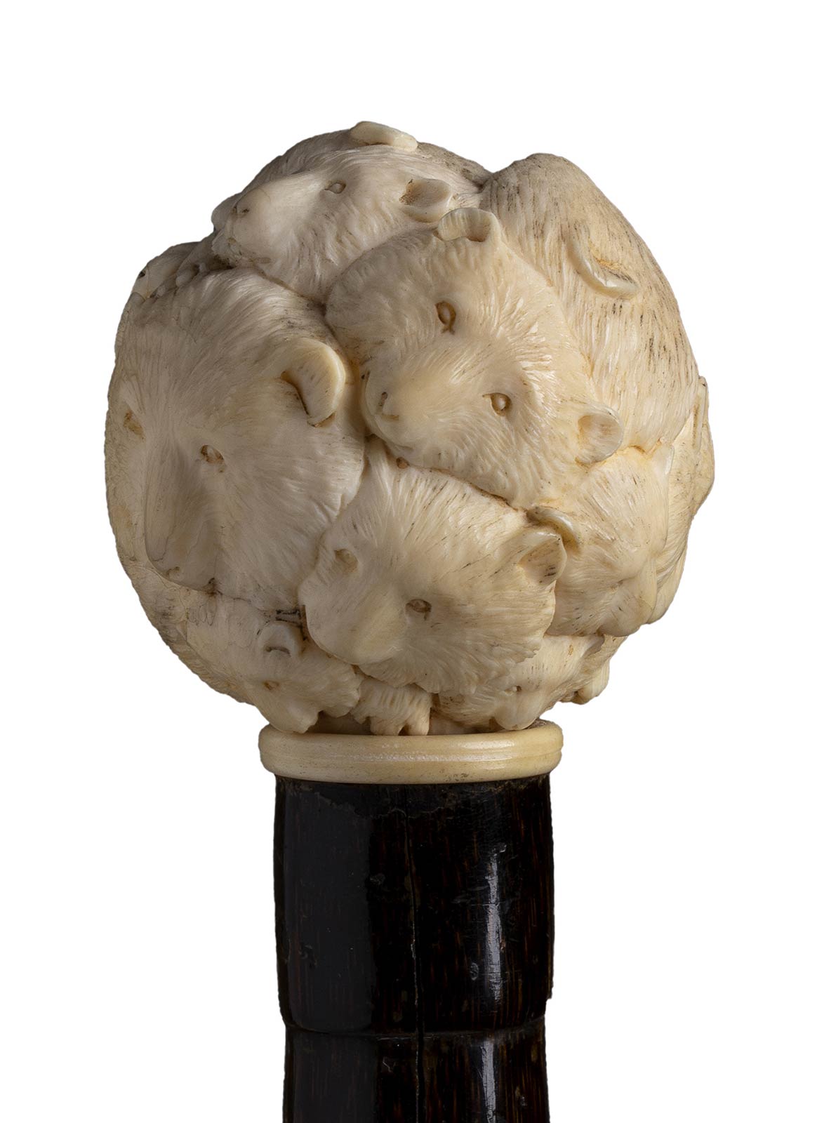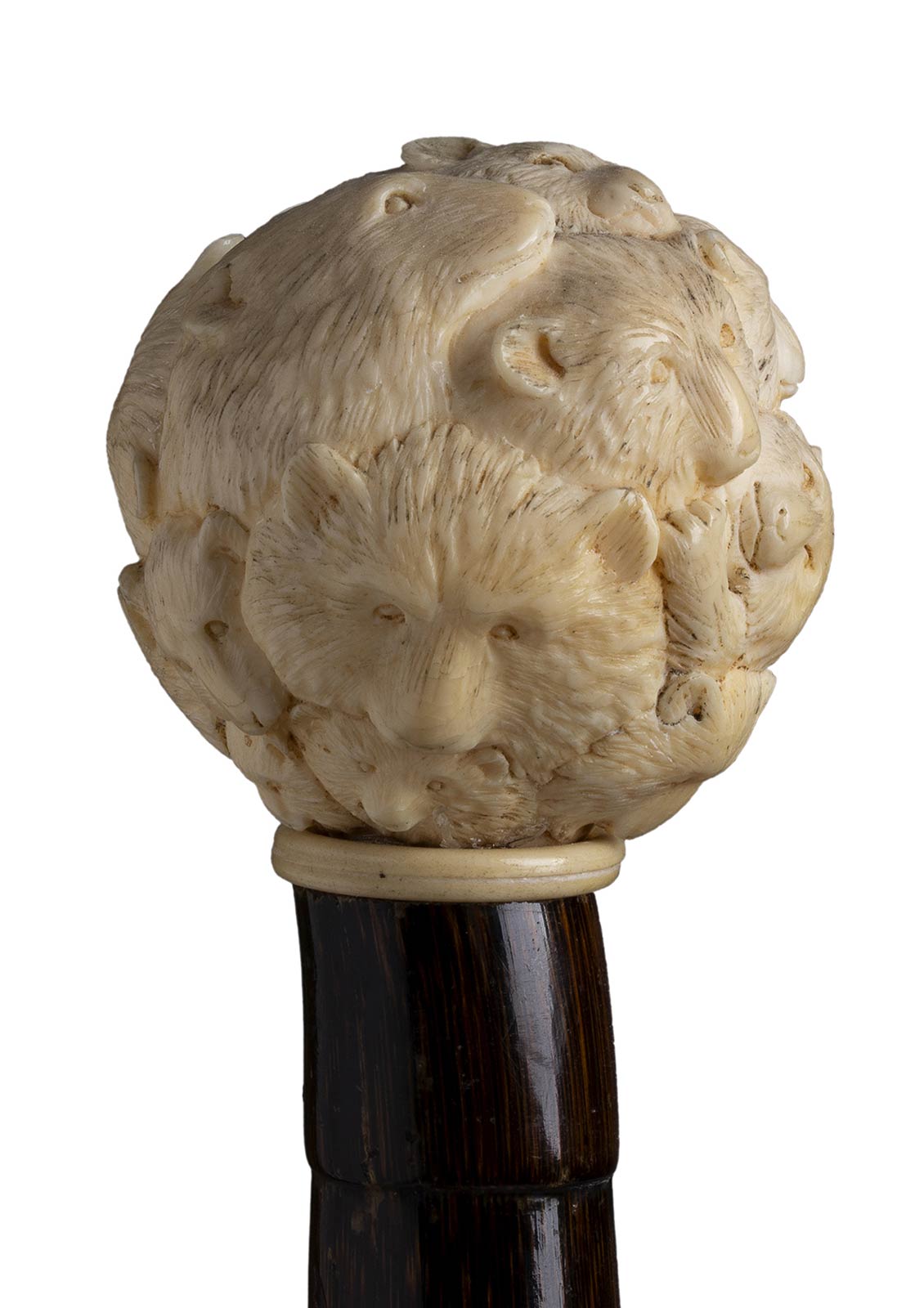 impugnatura a pomolo in avorio di elefante scolpita con teste di lupo. Asta in bamboo, collarino in avorio e puntale in metallo. Peso 374, gr, altezza 88,5 cm. Stato di conservazione: **** buono. Certificato di Antichità Ce.S.Ar.