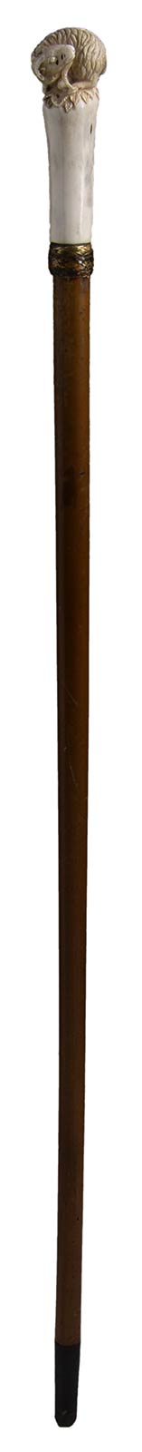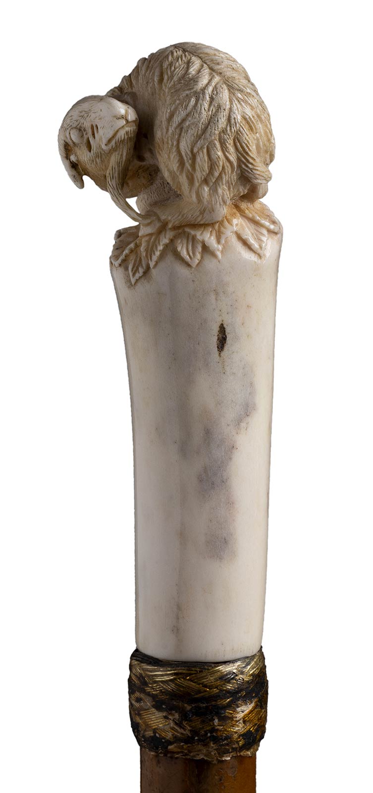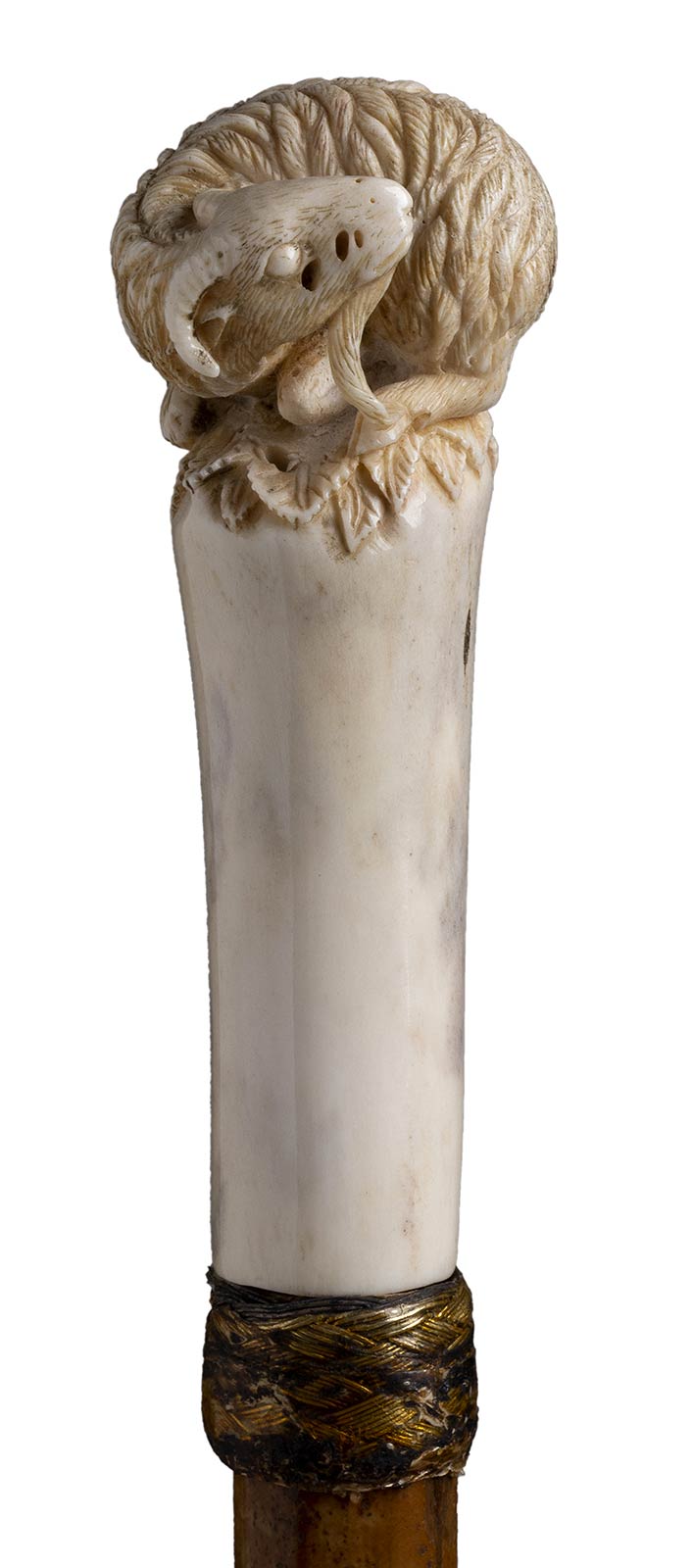 impugnatura cilindrica in osso leggermente svasata cimata da una capra. Asta in malacca, collarino in metallo dorato decorato a treccia e puntale in metallo. Peso 229 gr, altezza 88 cm. Stato di conservazione: **** buono.