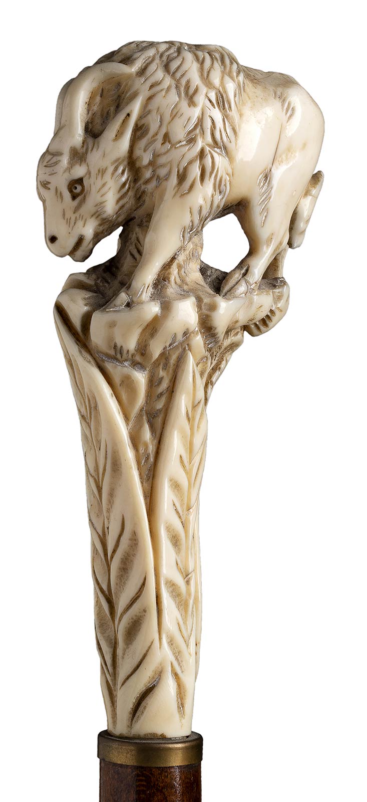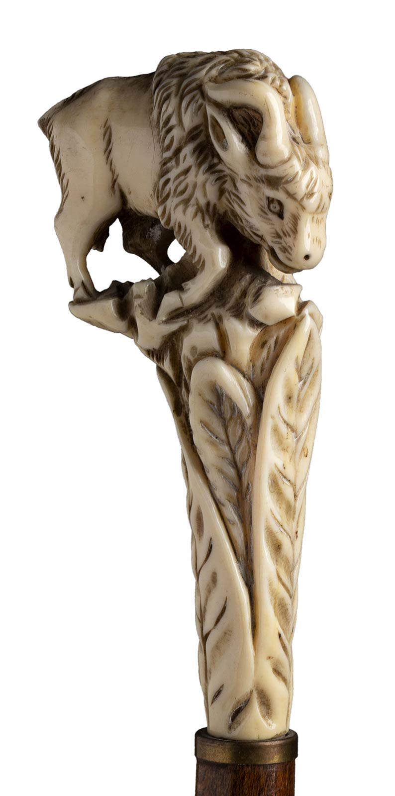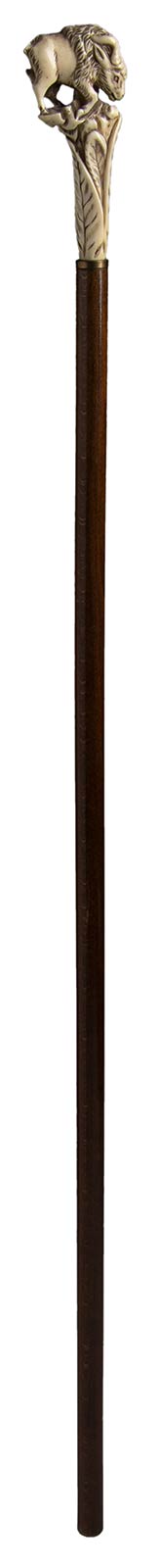 impugnatura verticale in avorio di elefante scolpita con un tronco d'albero cimato da bisonte. Asta in legno chiaro, collarino in metallo liscio. Peso 247 gr, altezza 93,5 cm. Stato di conservazione: **** buono. Certificato di Antichità Ce.S.Ar. (pre-1947).