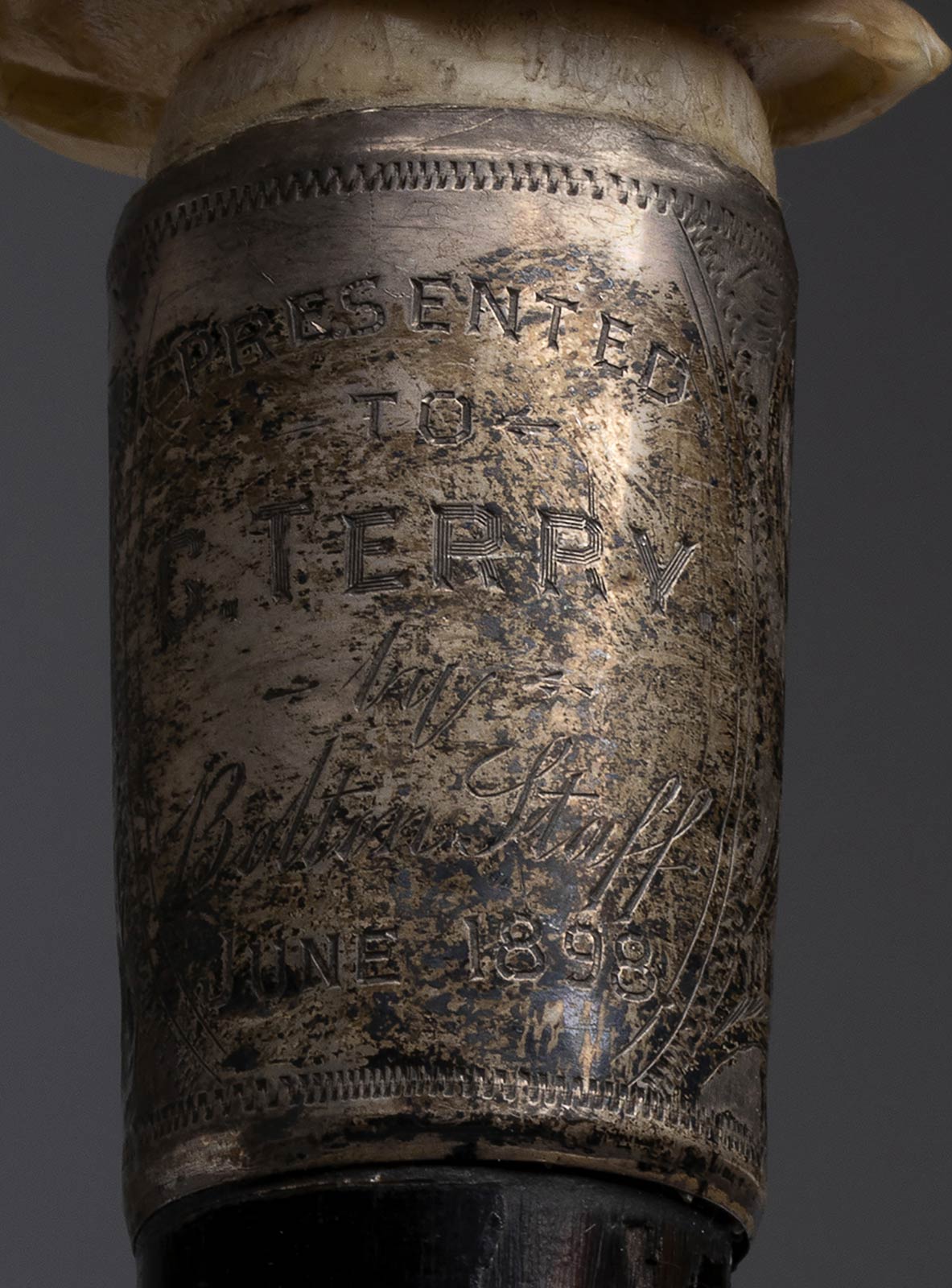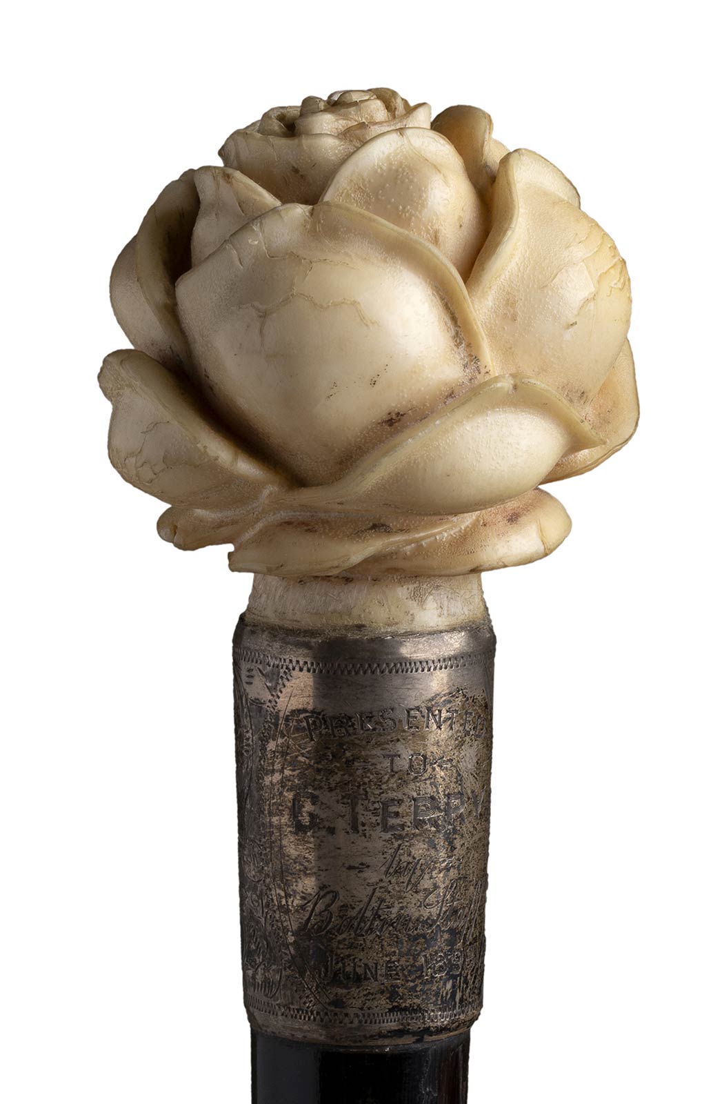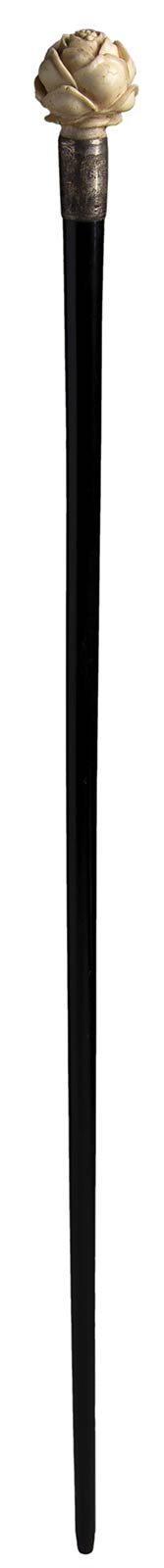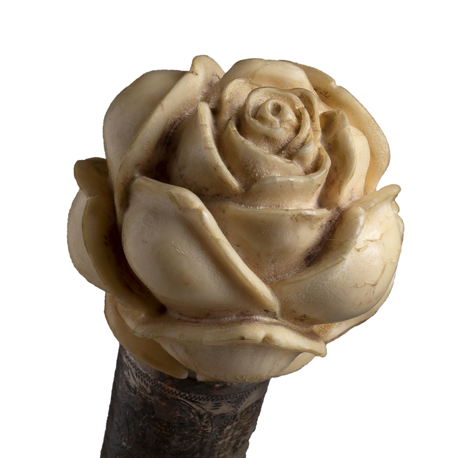 impugnatura a pomolo in avorio di elefante scolpita con rosa. Asta il legno ebanizzato, collarino in argento 925/1000 con iscrizione "Presented to G. Terry by Bolton staff june 1898" e punzonato Chester 1897-98. Peso 348 gr, altezza 92,5cm. Stato di conservazione: **** quasi buono (puntale assente). Certificato di Antichità Ce.S.Ar. (pre-1947).