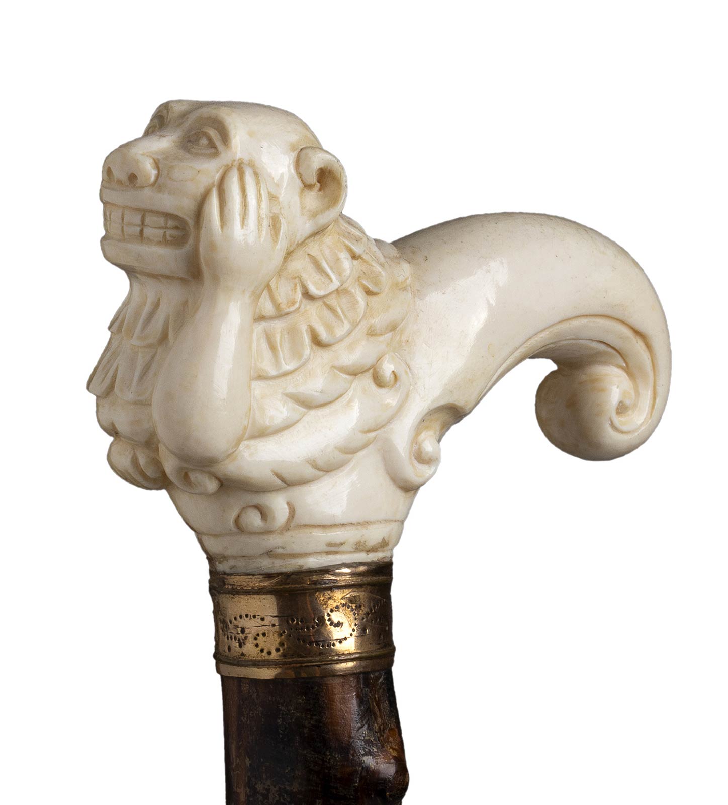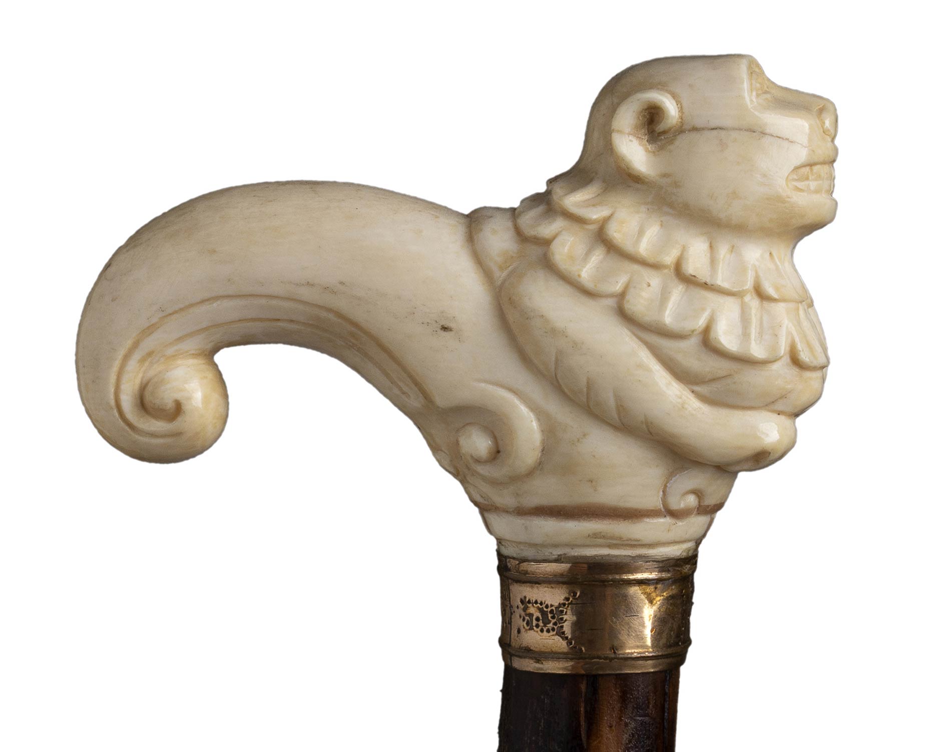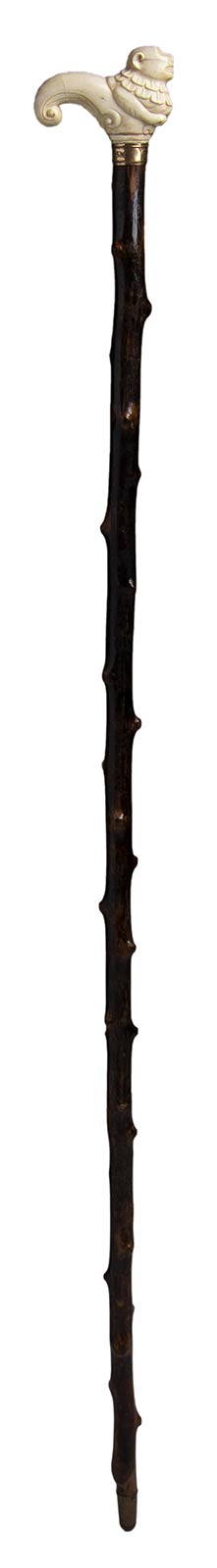 impugnatura ad "L" in avorio di elefante scolpita con testa di animale stilizzato. Asta in biancospino, collarino in metallo inciso con stilemi floreali e puntale in metallo. Peso 170 gr, altezza 83,5 cm. Stato di conservazione: **** buono. Certificato di Antichità Ce.S.Ar. (pre-1947).