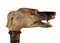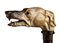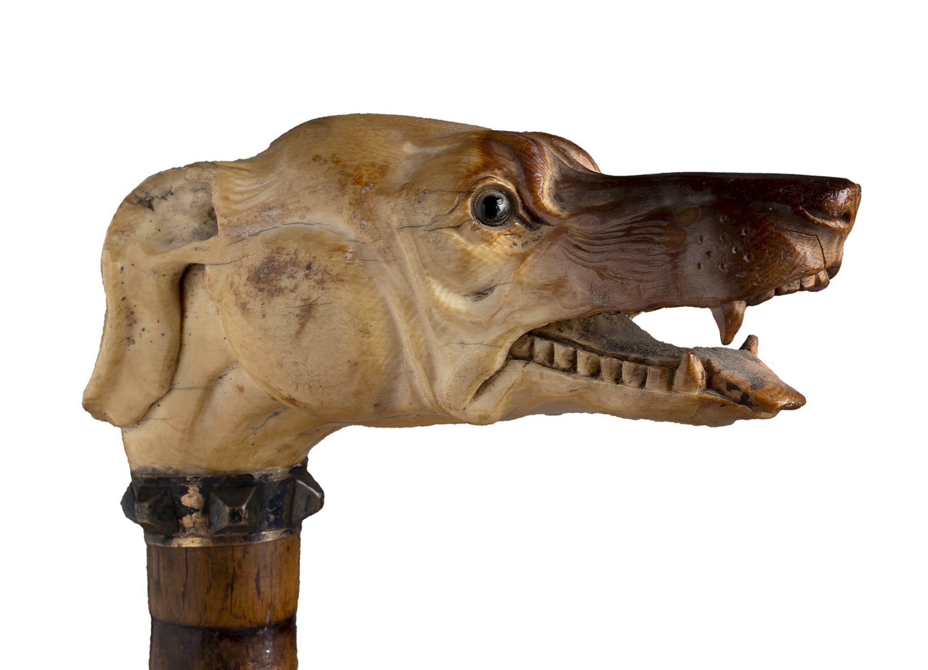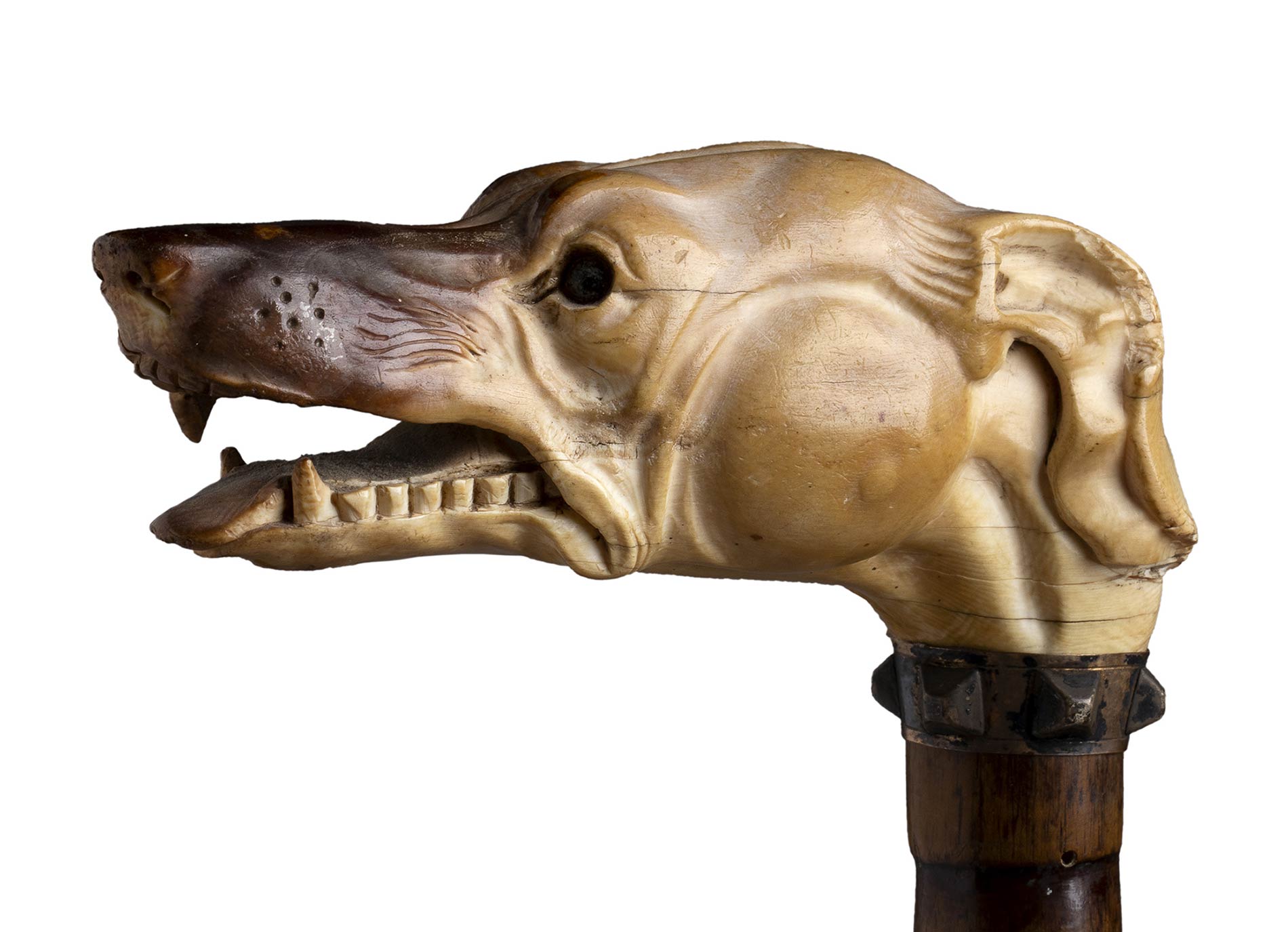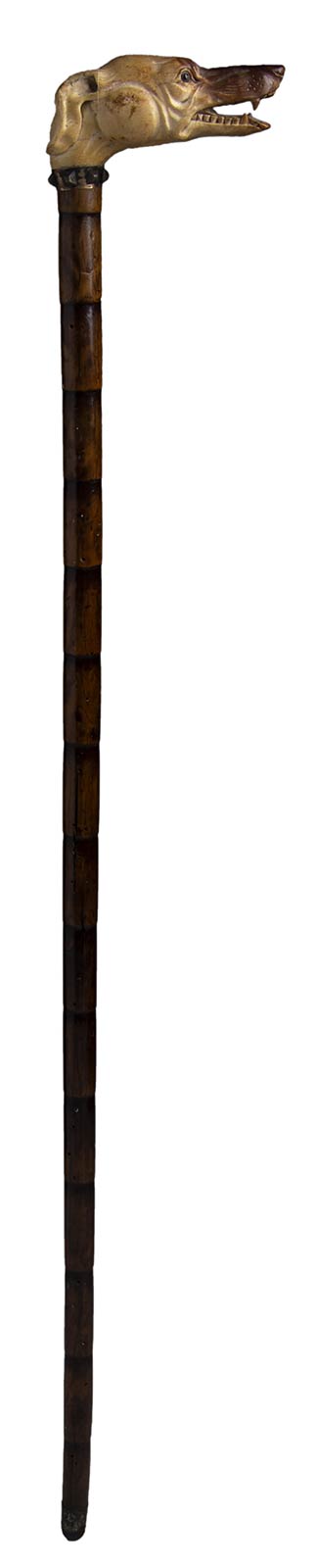 impugnatura ad "L" in avorio di elefante scolpita con testa di cane. Asta in bamboo, collarino in metallo decorato con borchie troncoconiche e puntale in metallo. Peso 413 gr, altezza 88,5 cm. Stato di conservazione: **** buono (difetti). Certificato di Antichità Ce.S.Ar. (pre-1947).