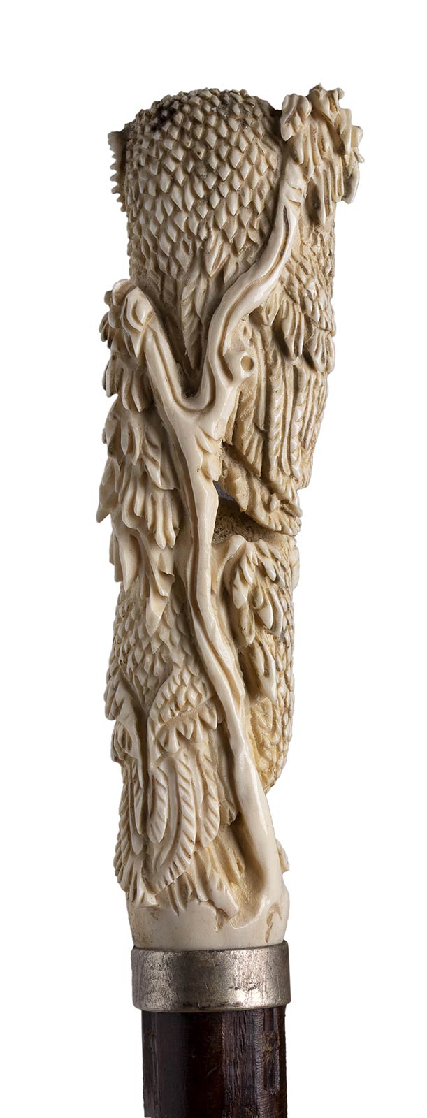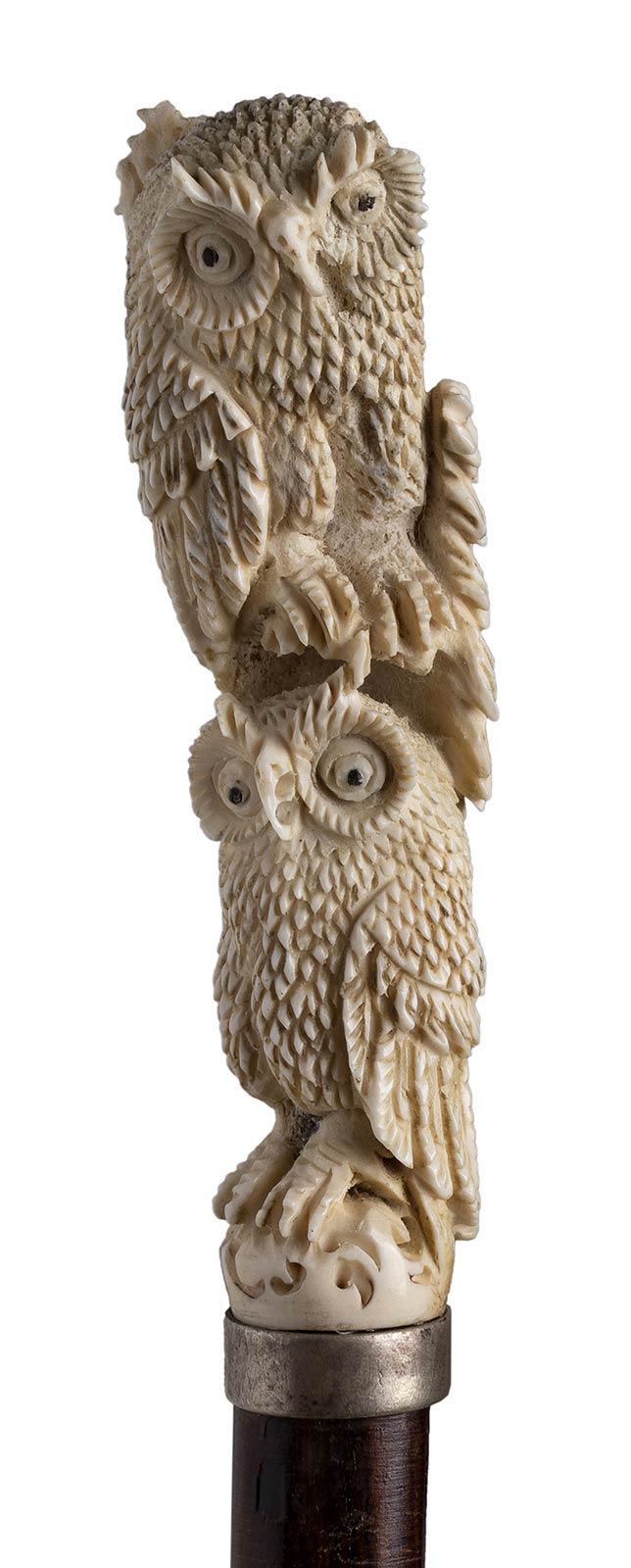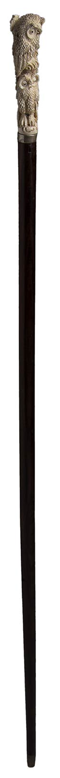 impugnatura giapponese verticale in osso scolpita con due civette. Asta in palissandro, collarino in metallo liscio e puntale in metallo. Peso 276 gr, altezza 99,5 cm. Stato di conservazione: **** buono. Certificato di Antichità Ce.S.Ar. (pre-1947).