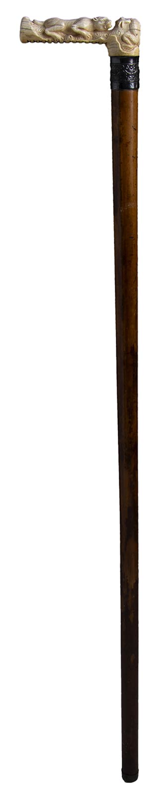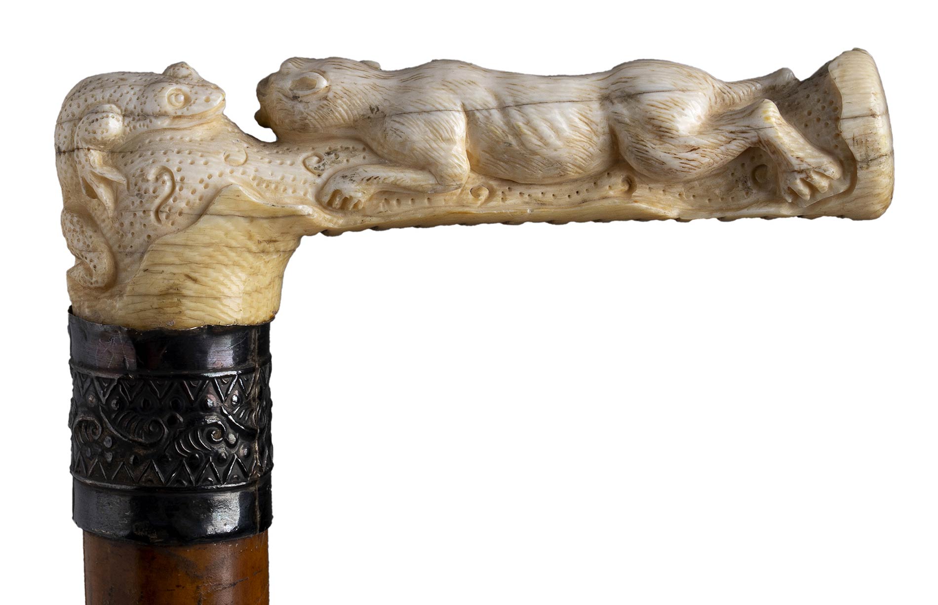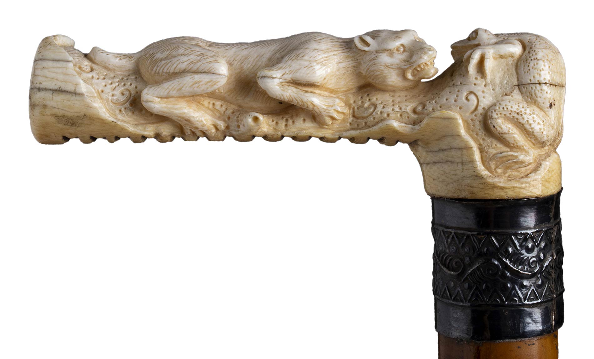 impugnatura ad "L" in avorio di elefante scolpita con tigre e rana. Asta in malacca, collarino in metallo decorato con stilemi floreali e puntale in metallo. Peso 282 gr, altezza 88 cm. Stato di conservazione: **** buono. Certificato di Antichità Ce.S.Ar. (pre-1947).