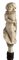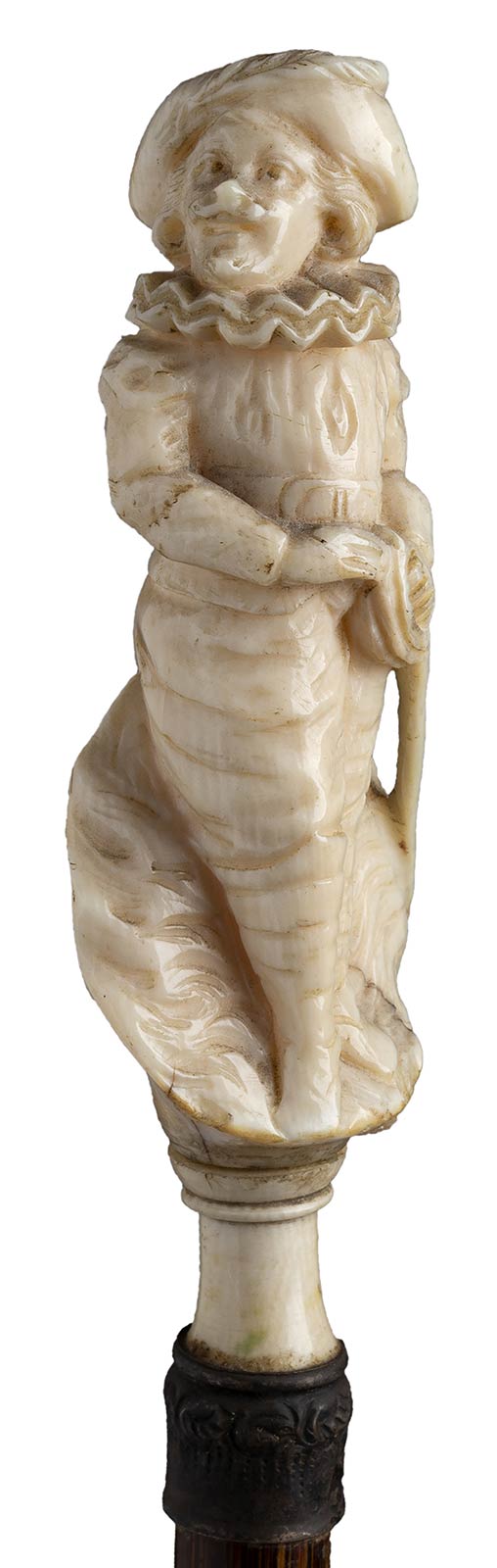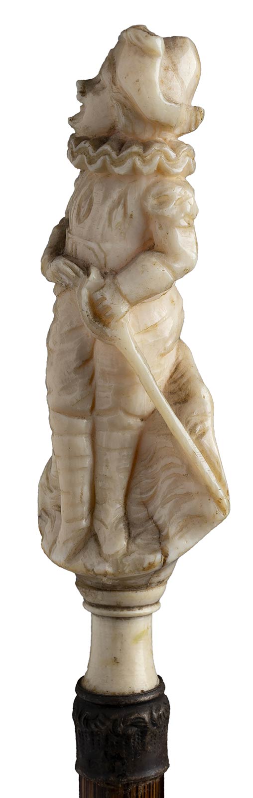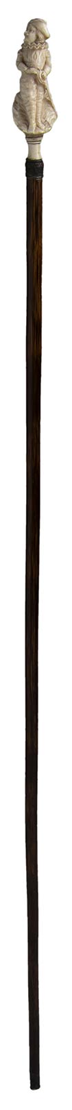 impugnatura in avorio di elefante scolpita con personaggio maschile. Asta in legno scuro, collarino in metallo e puntale in metallo. Peso 87 gr, altezza 85,5 cm. Stato di conservazione: **** buono. Certificato di Antichità Ce.S.Ar. (pre-1947).