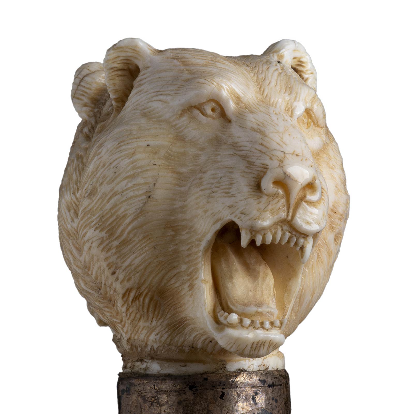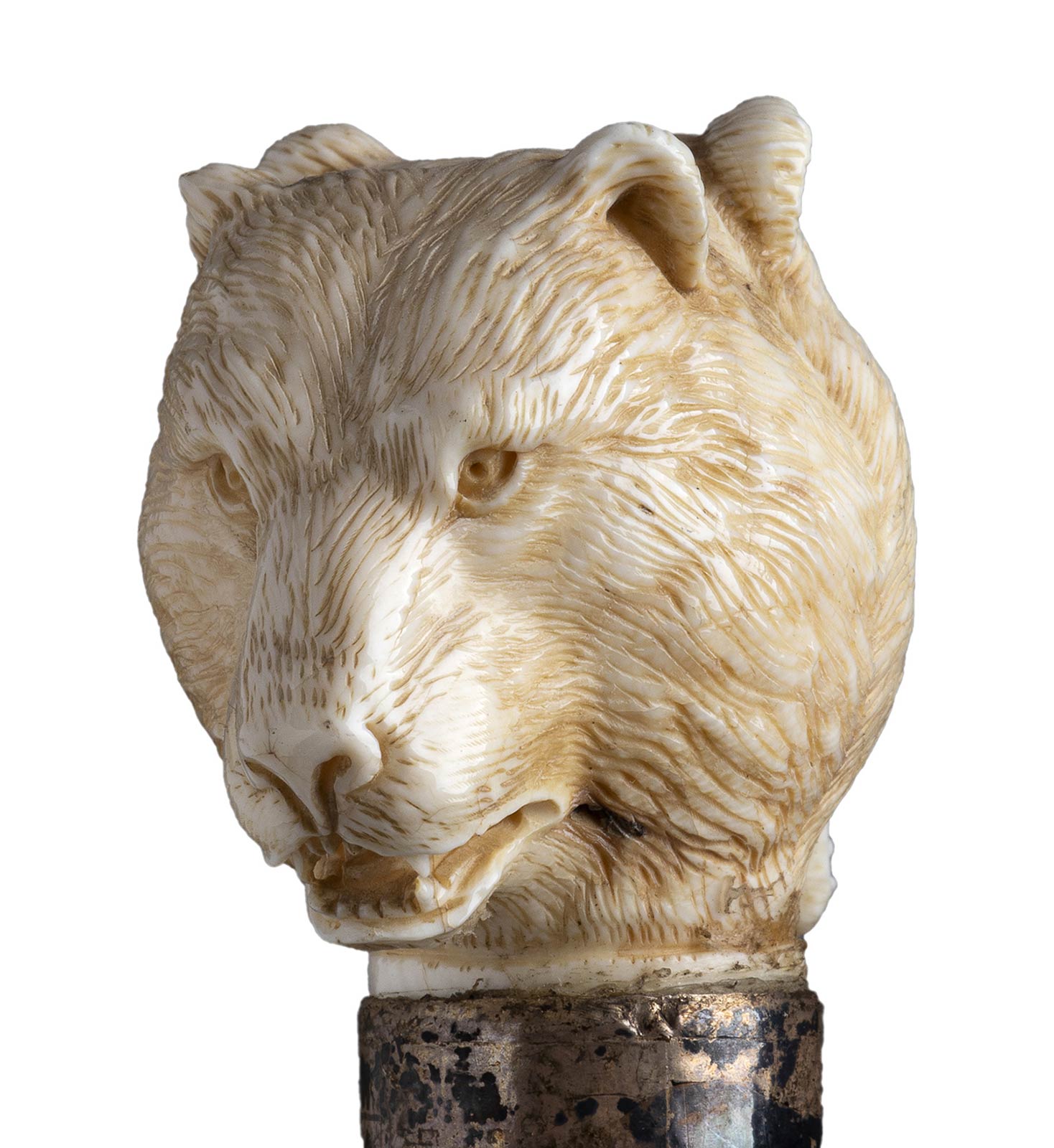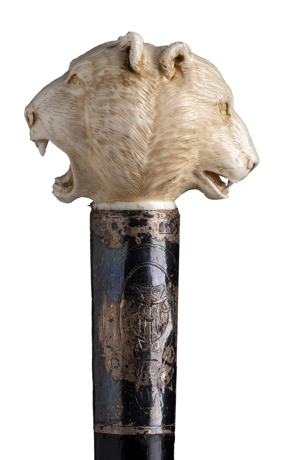 impugnatura a pomolo in avorio di elefante scolpita con due teste di leone contrapposte. Asta in ebano, collarino in argento 925/1000 inciso con stilemi floreali e monogramma punzonato Londra 1904-1905 e puntale in metallo. Peso 232 gr, altezza 92,5 cm. Stato di conservazione: **** buono. Certificato di Antichità Ce.S.Ar. (pre-1947).