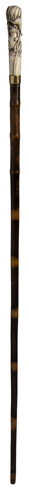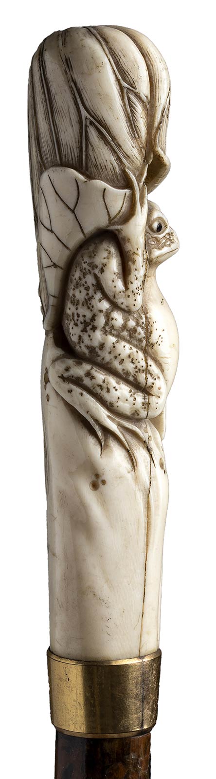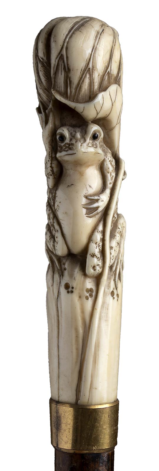 impugnatura giapponese verticale in avorio di elefante scolpita con una rana. Asta in bamboo, collarino in metallo dorato liscio e puntale in metallo. Peso 154 gr, altezza 97 cm. Stato di conservazione: **** buono. Certificato di Antichità Ce.S.Ar. (pre-1947)