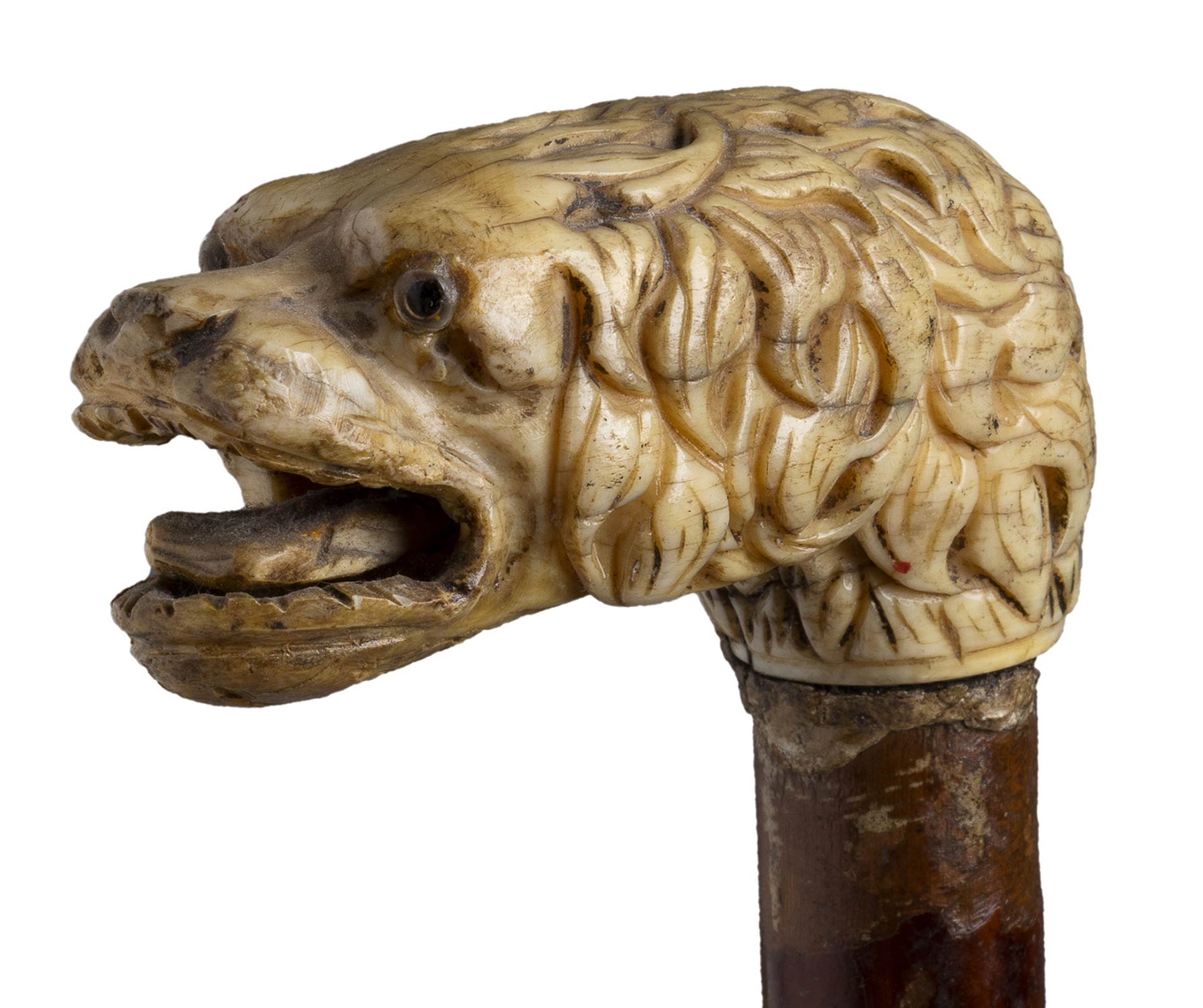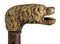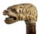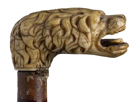 impugnatura ad "L" in avorio di elefante scolpita con testa di cane. Asta in malacca e puntale in metallo. Peso 278 gr, altezza 87 cm. Stato di conservazione: *** discreto (collarino assente). Certificato di Antichità Ce.S.Ar. (pre-1947).