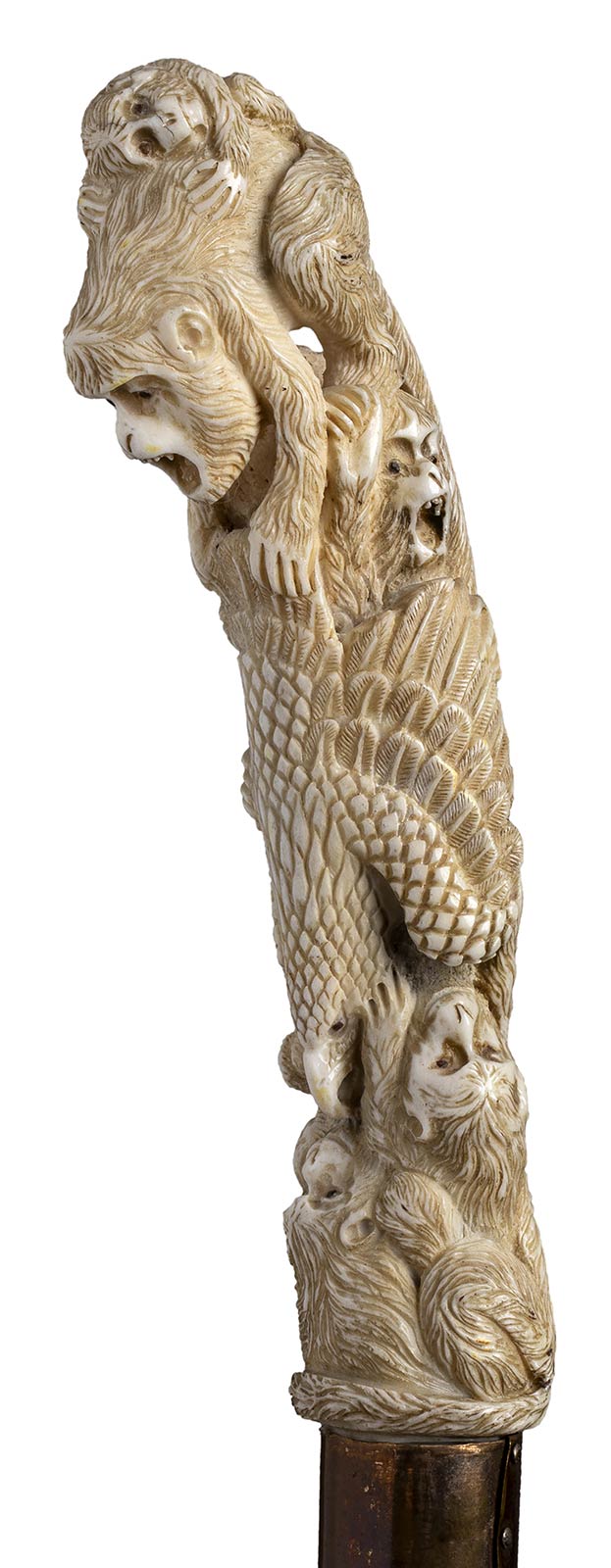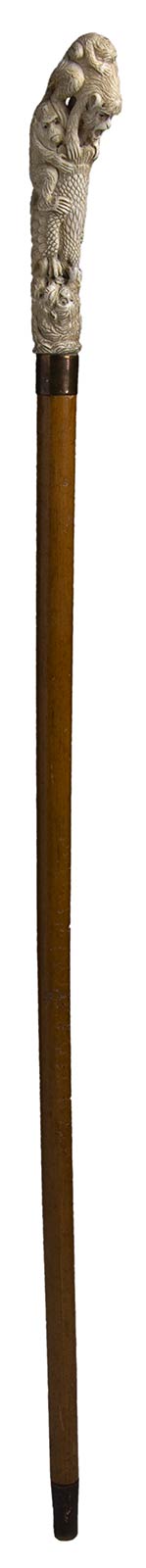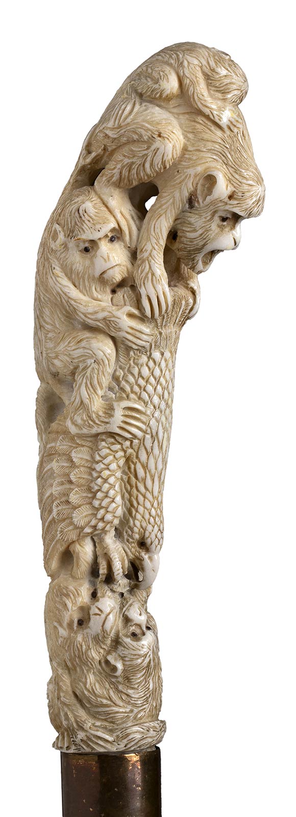 impugnatura giapponese verticale in osso scolpita con macachi ed un'aquila. Asta in legno chiaro, collarino liscio in metallo dorato e puntale in metallo. Peso 266 gr, altezza 85 cm. Stato di conservazione: **** buono.