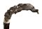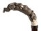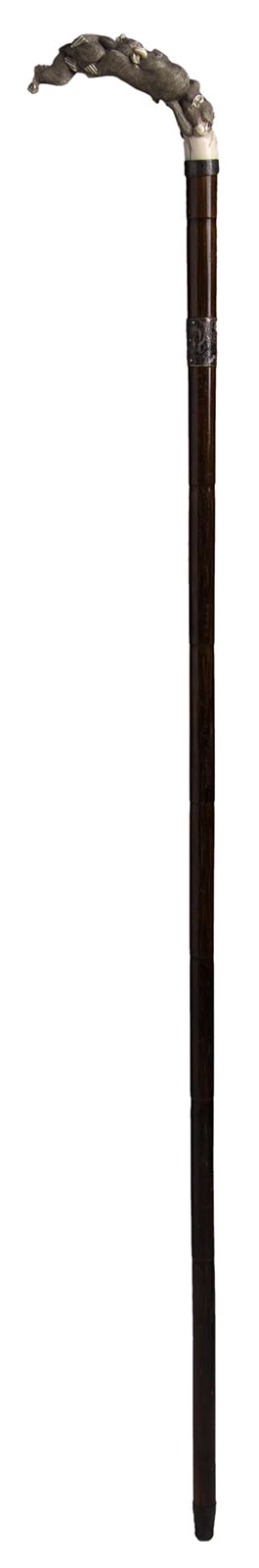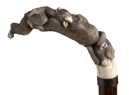 impugnatura giapponese ricurva verticale in avorio di elefante scolpita con macachi. Asta in bamboo, collarino in argento 925/1000 decorato con stilemi floreali punzonato Londra 1905-06 e puntale in metallo. Peso 208 gr, altezza 91 cm. Stato di conservazione: **** buono. Certificato di Antichità Ce.S.Ar. (pre-1947).