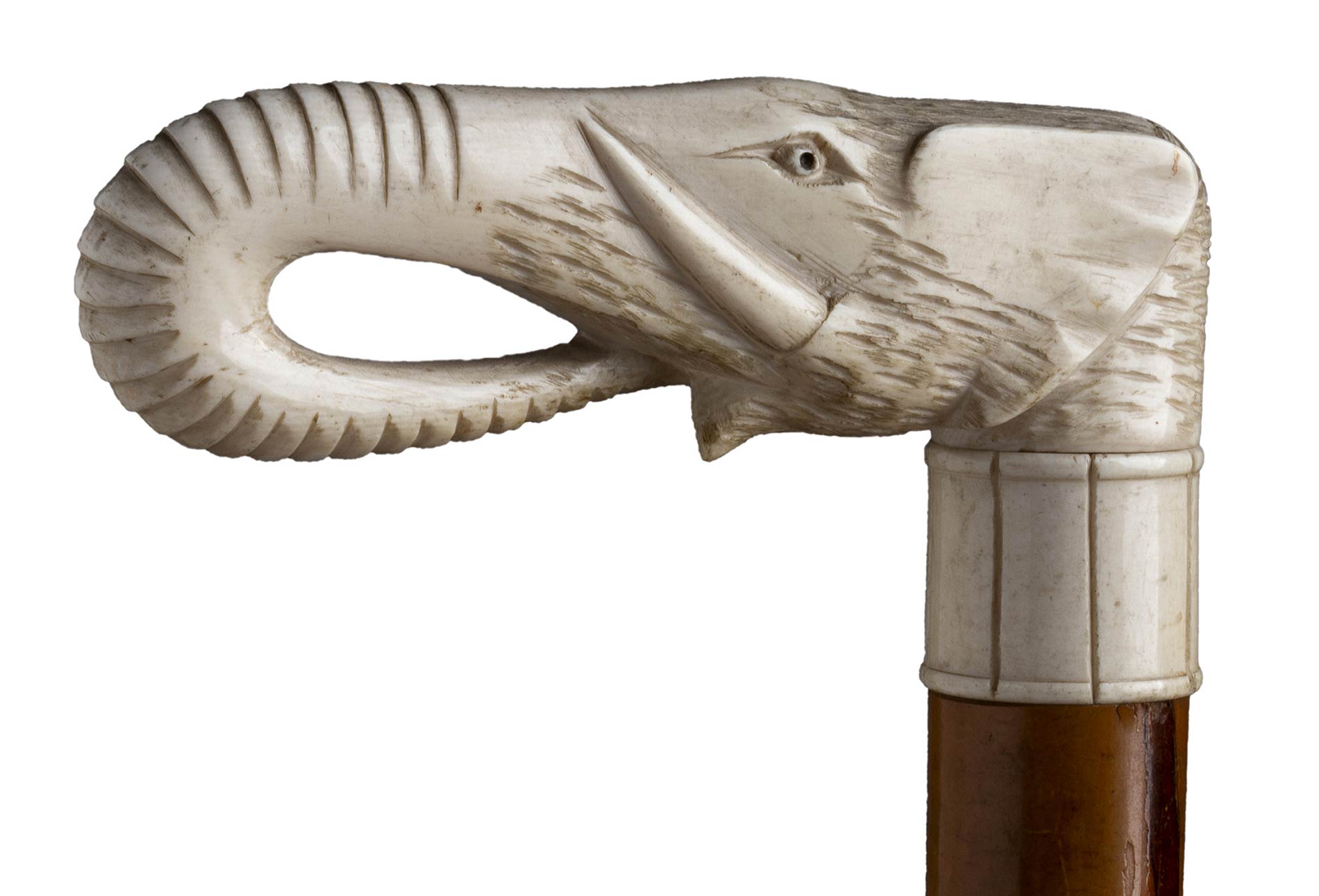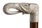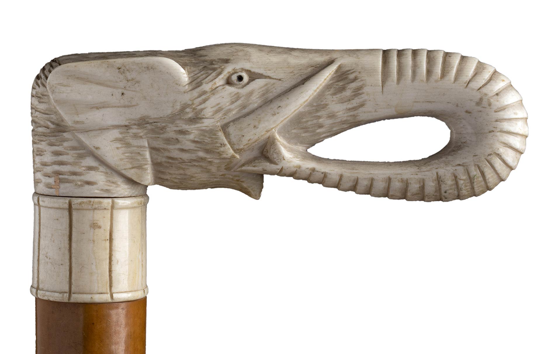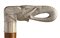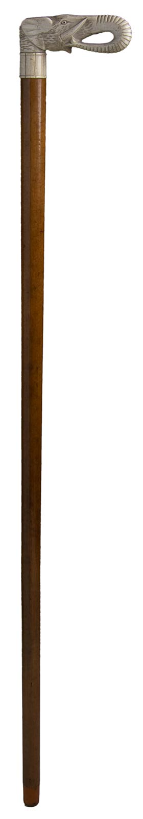 impugnatura ad "L" in avorio di elefante scolpita con testa di elefante. Asta in malacca, collarino in avorio e puntale in corno. Peso 338 gr, altezza 91 cm. Stato di conservazione: **** buono. Certificato di Antichità Ce.S.Ar. (pre-1947).