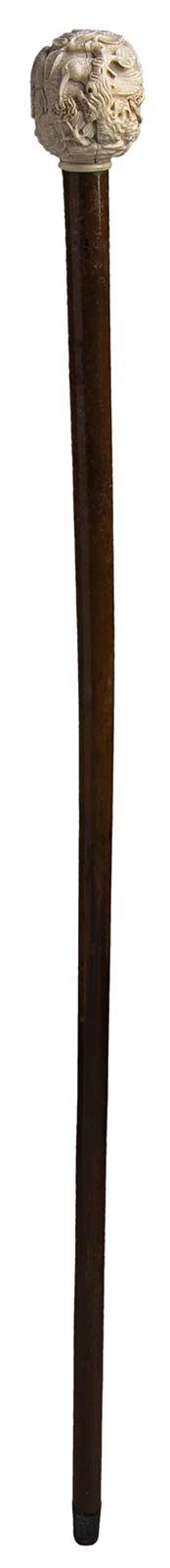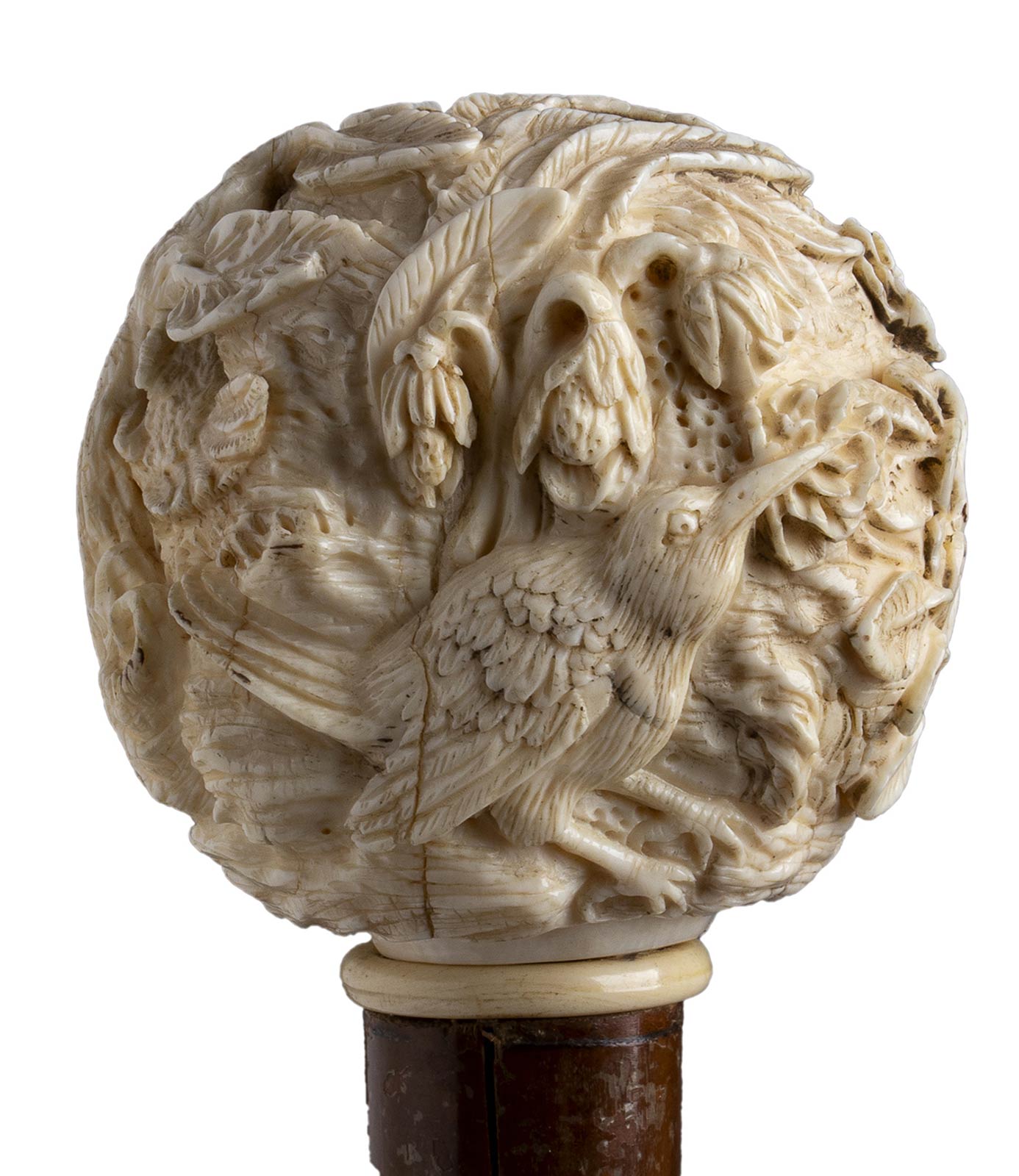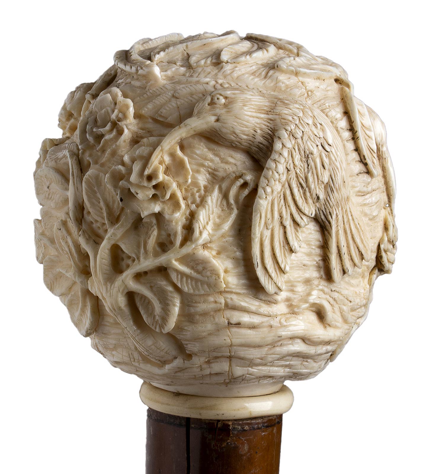 impugnatura a pomolo in avorio di elefante scolpita con uccelli e volute floreali. Asta in malacca, collarino in avorio e puntale in metallo. Peso 379 gr, altezza 88,5 cm. Stato di conservazione: **** buono. Certificato di Antichità Ce.S.Ar. (pre-1947).