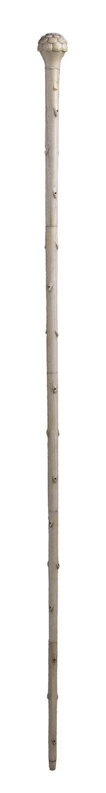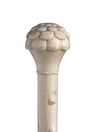 impugnatura a pomolo in avorio di elefante scolpita a fiore. Asta a segmenti in avorio spinato e gemmato, collarino e puntale in avorio. Peso 224 gr, altezza 87 cm. Stato di conservazione: **** buono. Certificato di Antichità Ce.S.Ar. (pre-1947)
