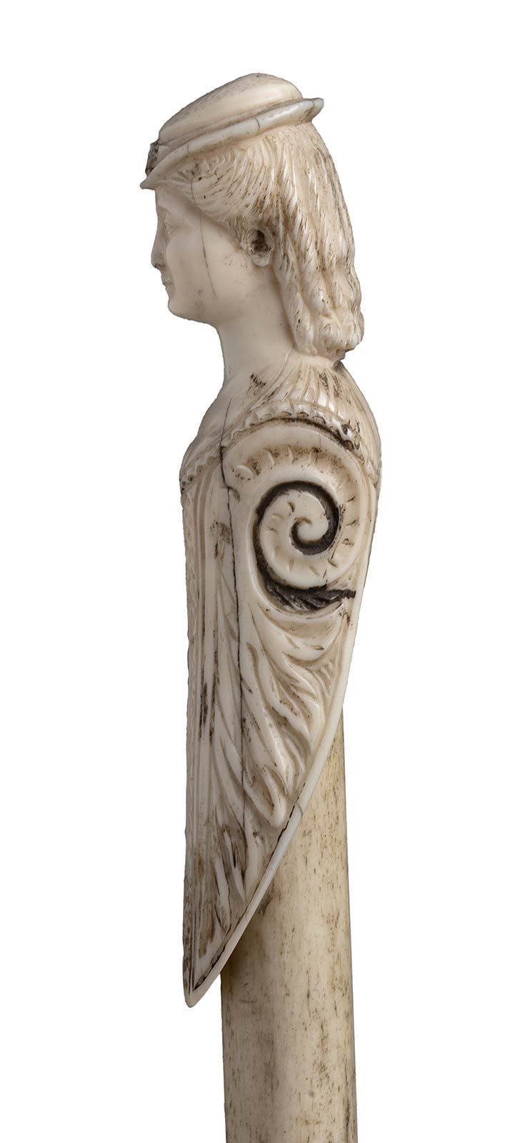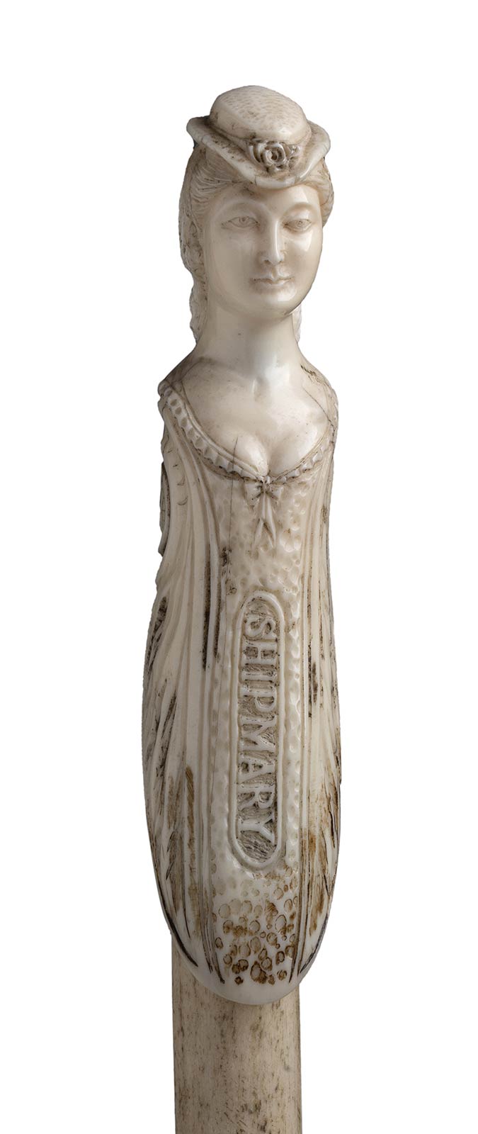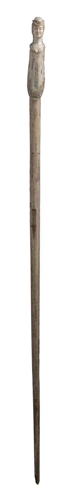 impugnatura verticale in avorio di elefante scolpita con figura femminile raffigurante polena di nave con iscrizione "Ship Mary". Asta intera in osso di balena. Le aste in ossa di balena provengono prevalentemente dai porti della costa orientale degli Stati Uniti e da porti britannici come Whitby, Hull e Leith. Peso 371 gr, altezza 84,5 cm. Stato di conservazione: **** quasi buono (puntale assente). Certificato di Antichità Ce.S.Ar. (pre-1947).
