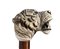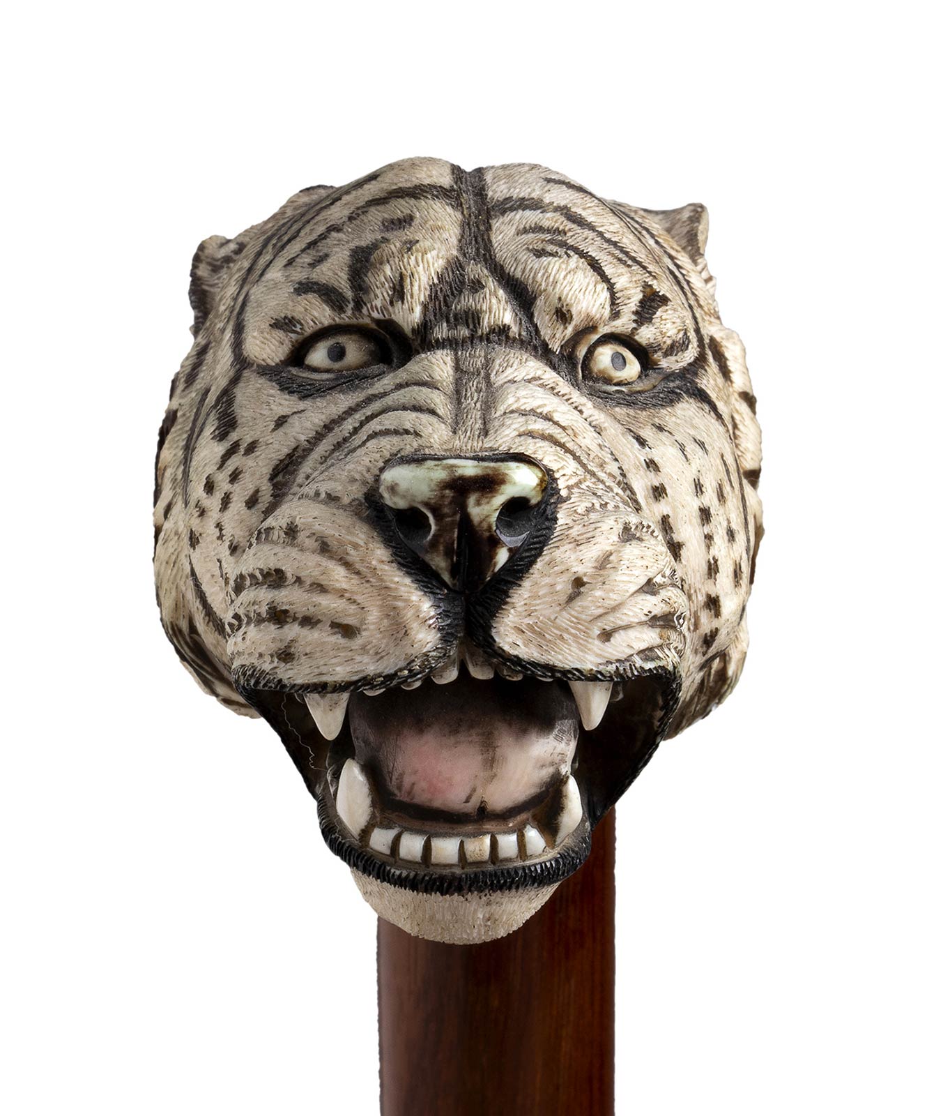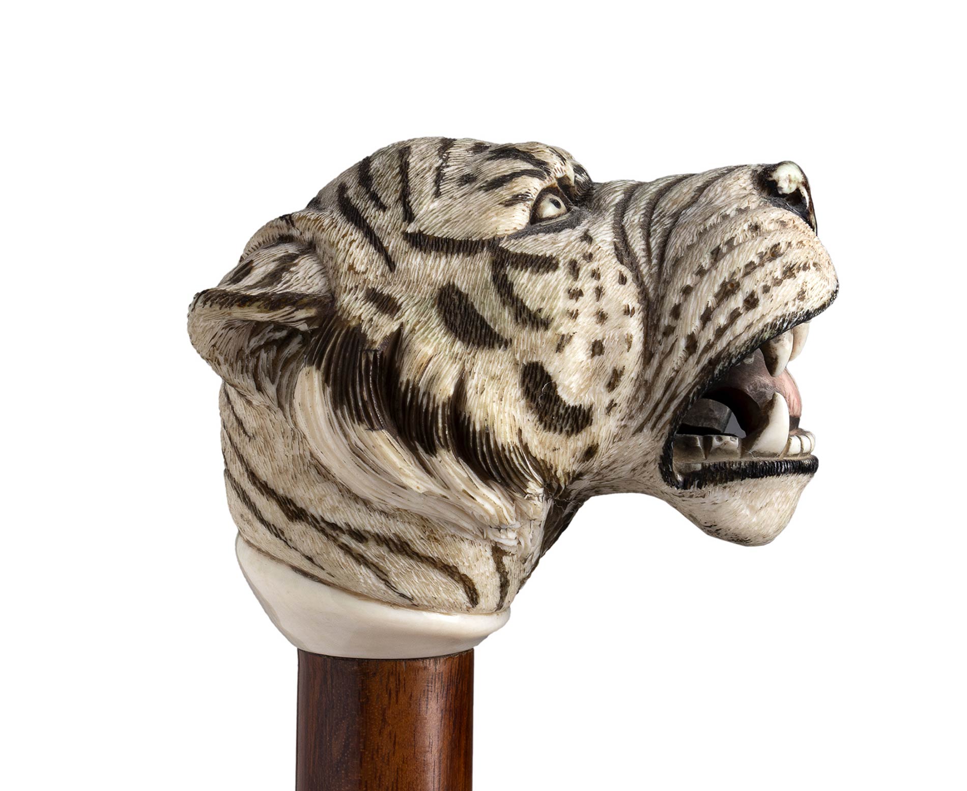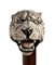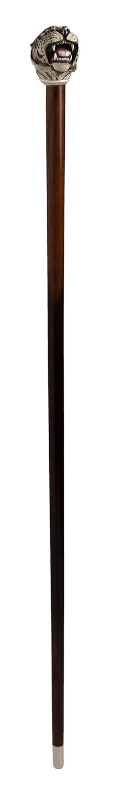 impugnatura ad "L" in avorio di elefante scolpita con testa di tigre. Asta in legno di serpente, collarino e puntale in avorio. Peso 454 gr, altezza 89,5 cm. Stato di conservazione: **** buono. Certificato di Antichità Ce.S.Ar. (pre-1947).