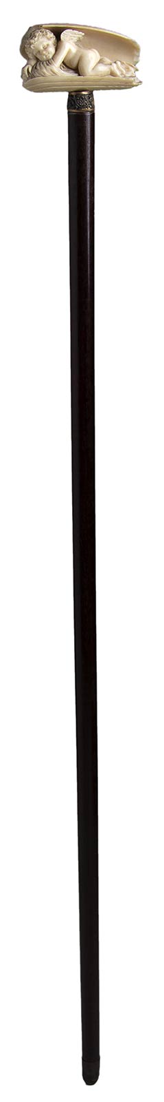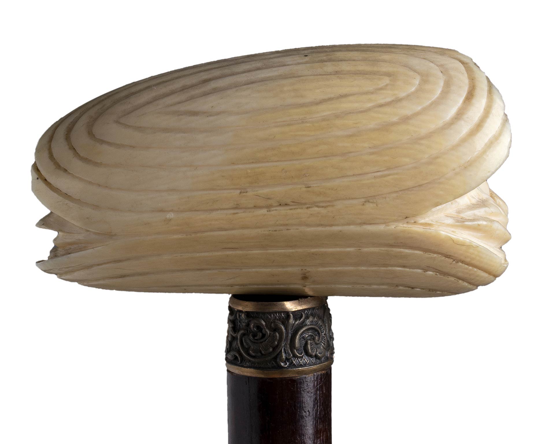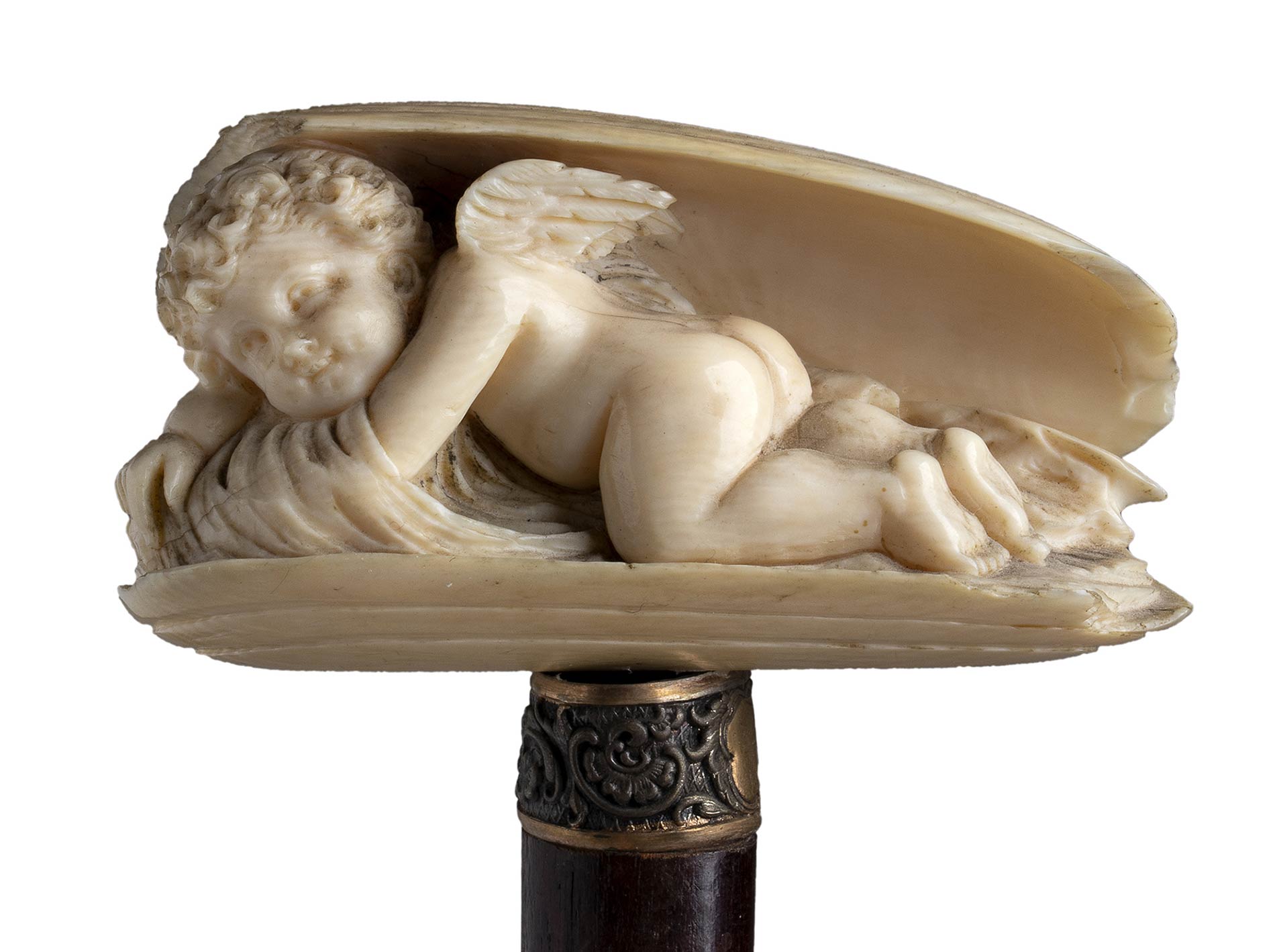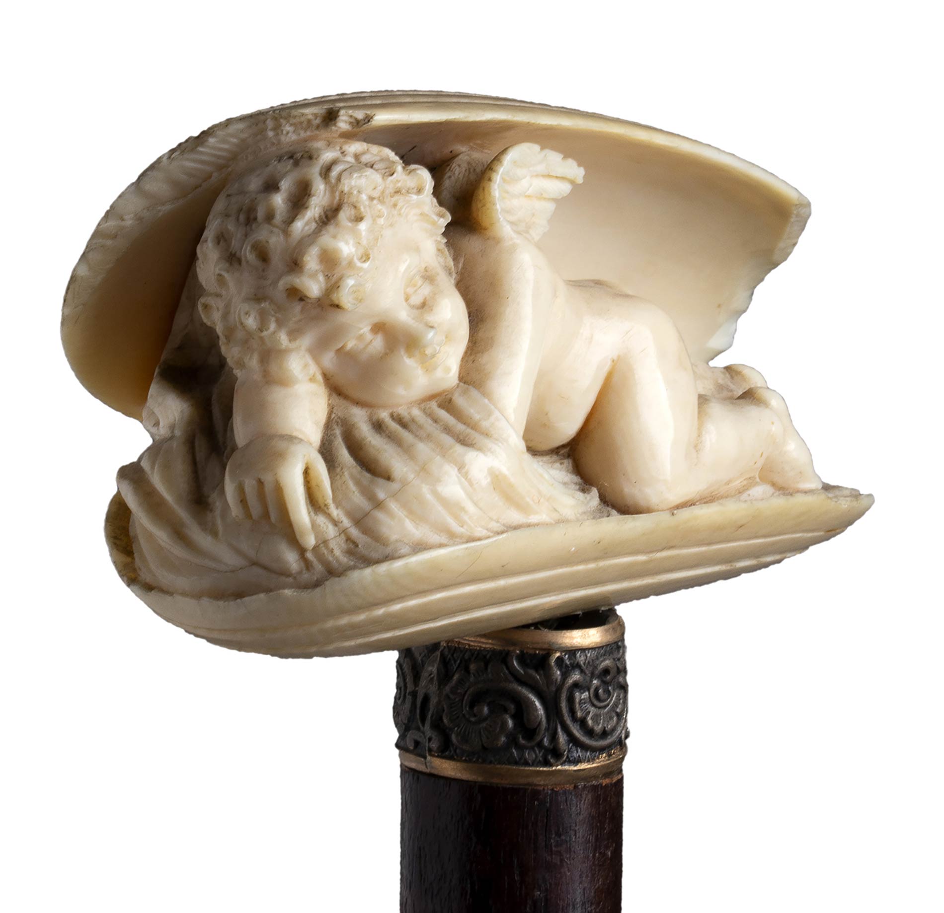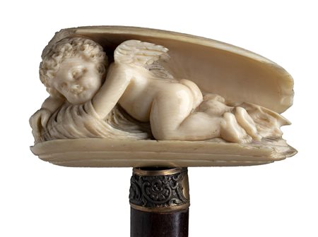 impugnatura orizzontale in avorio di elefante scolpita con una conchiglia contenente un putto alato. Asta in legno di serpente, collarino in metallo liscio e puntale in metallo. Peso 521 gr, altezza 95 cm. Stato di conservazione: **** quasi buono (difetti). Certificato di Antichità Ce.S.Ar. (pre-1947).