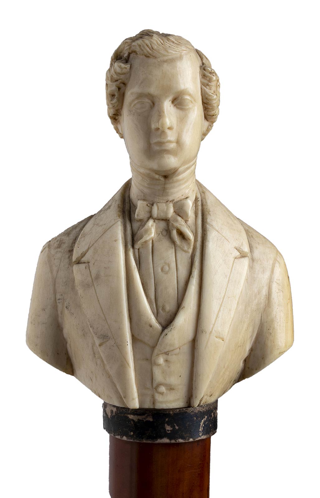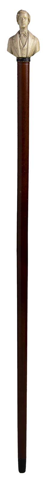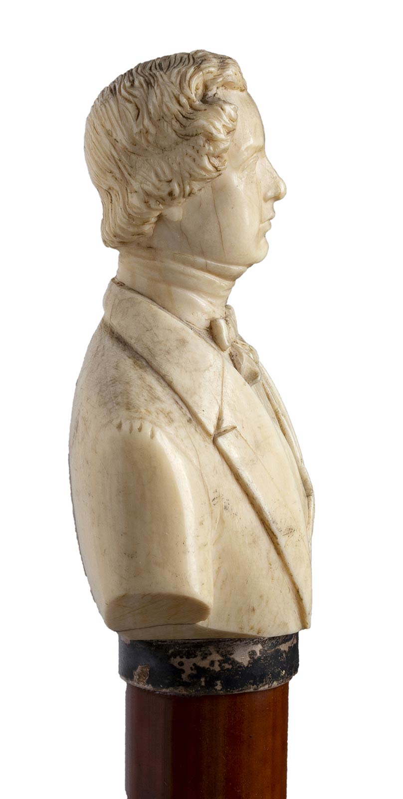 impugnatura verticale in avorio di elefante scolpita con il busto di un personaggio maschile. Asta in malacca, collarino in metallo liscio e puntale in legno. Peso 237 gr, altezza 85,5 cm. Stato di conservazione: **** buono. Certificato di Antichità Ce.S.Ar. (pre-1947).