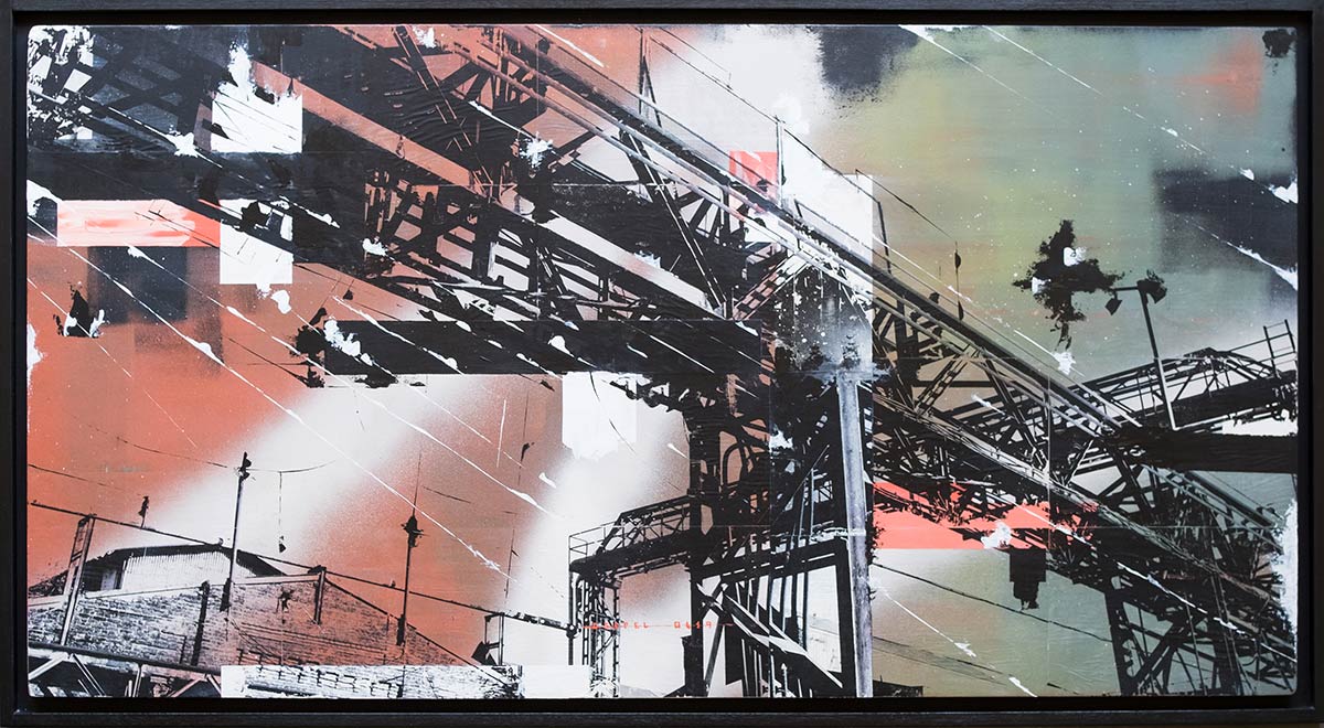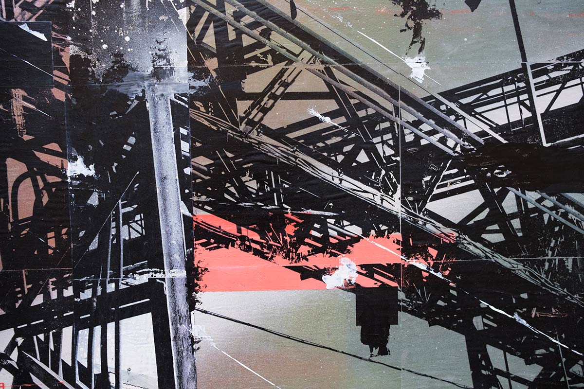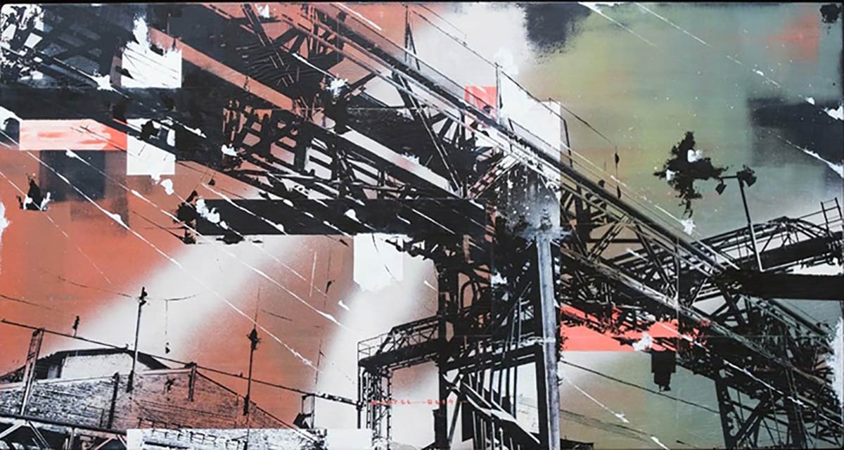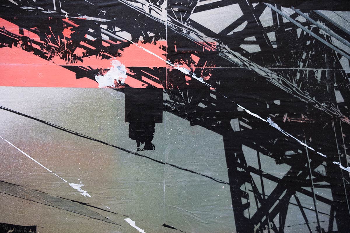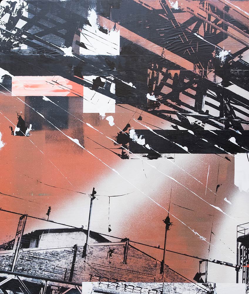 Trasferimento fotografico, acrilico e spray su legno, 65 x 125 cm