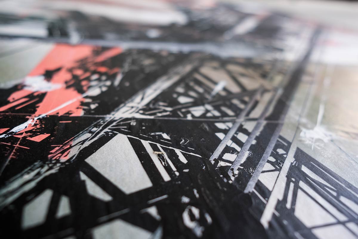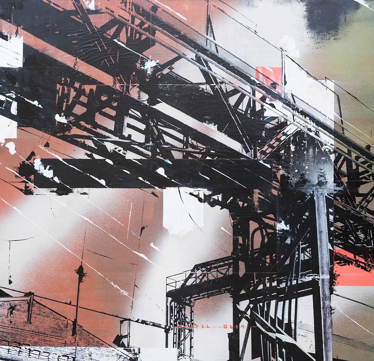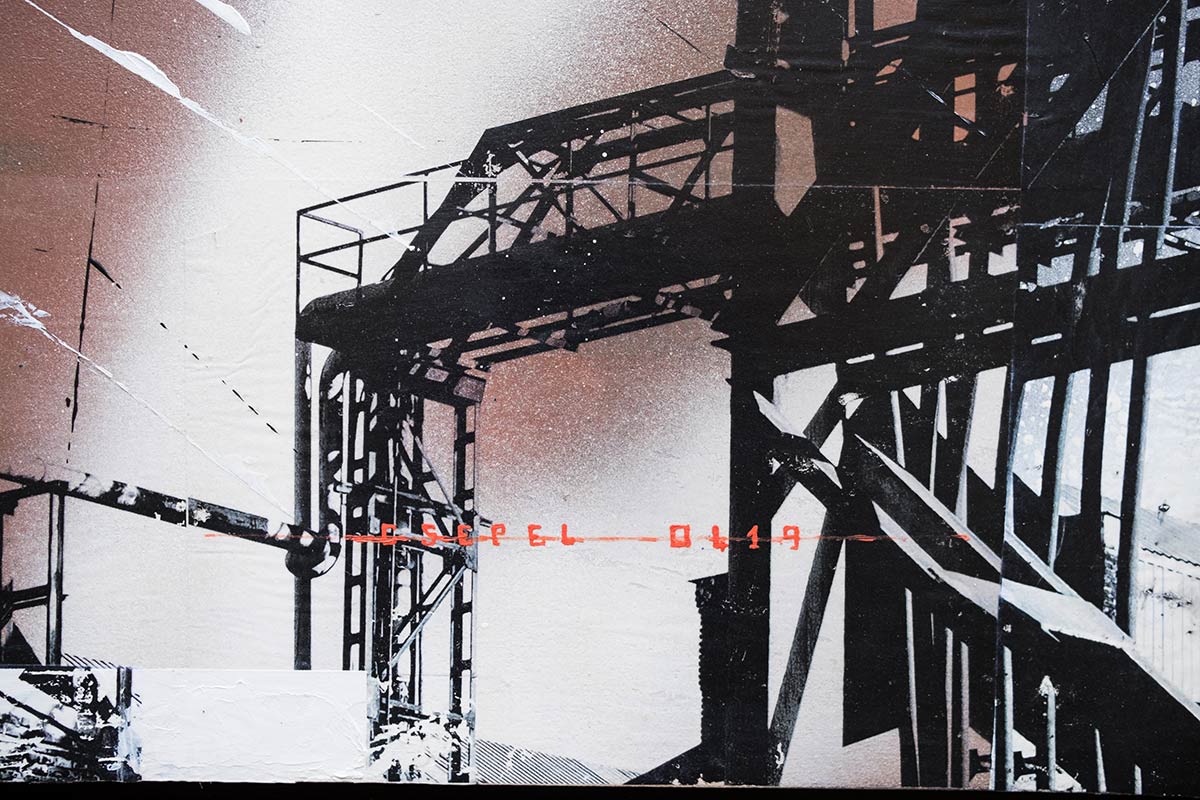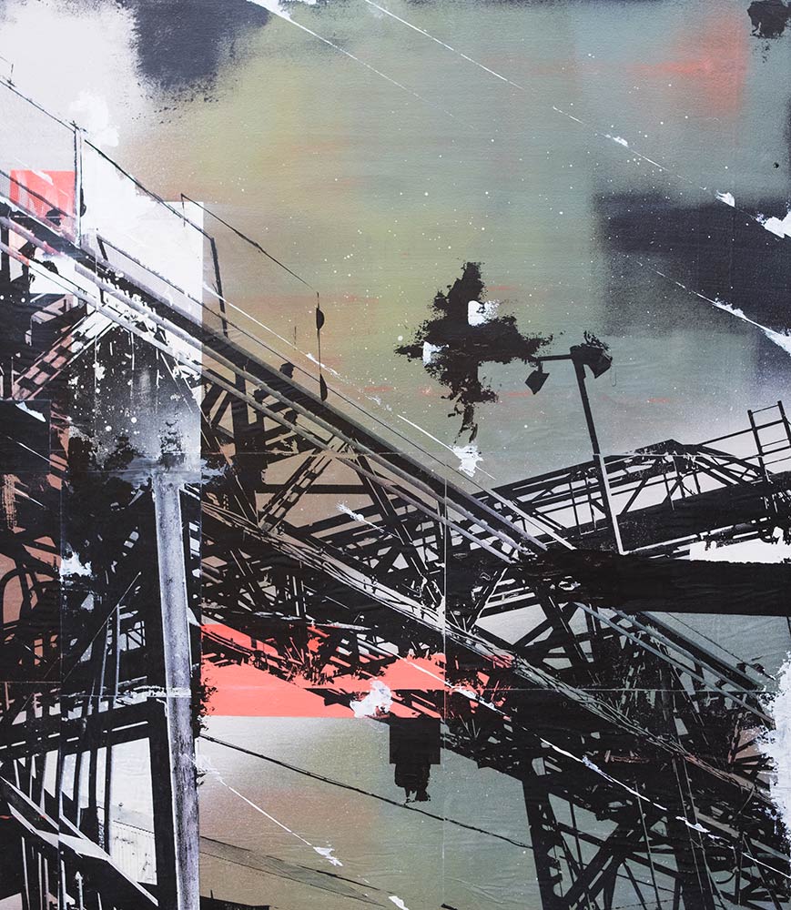 Trasferimento fotografico, acrilico e spray su legno, 65 x 125 cm