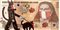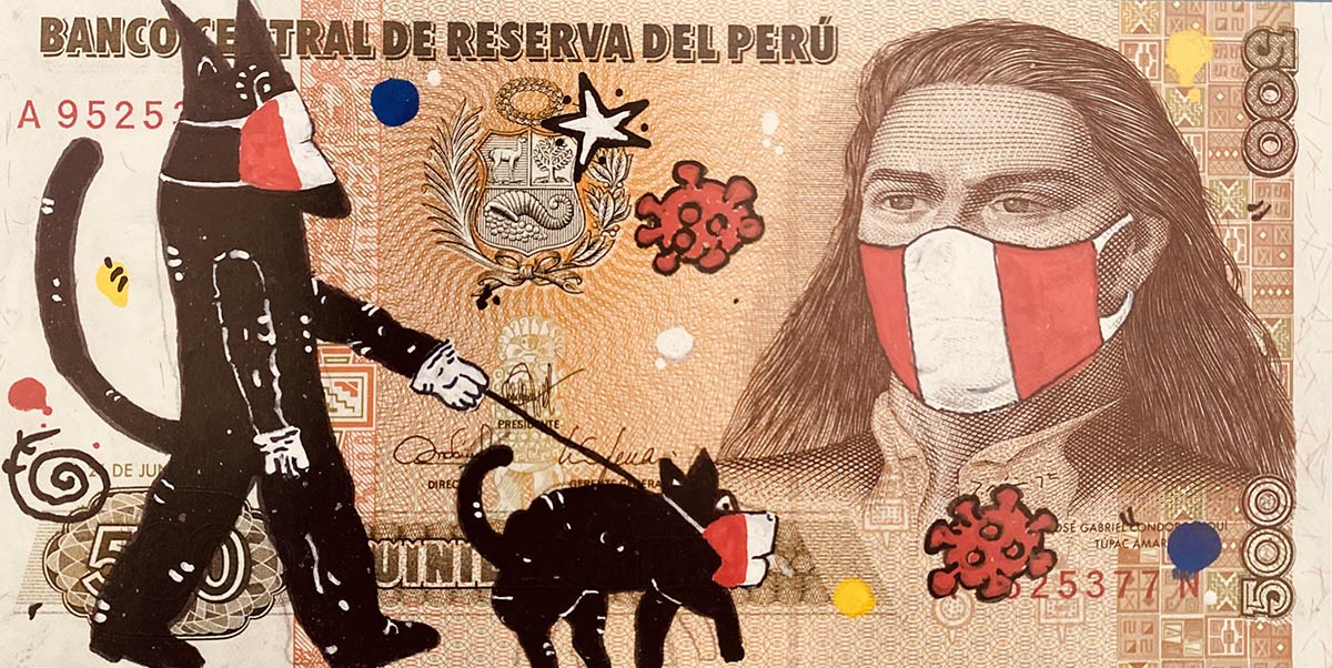 Tecnica mista (collage, pennarello Posca e acrilico) su banconota da 50 intis Repubblica del Perù