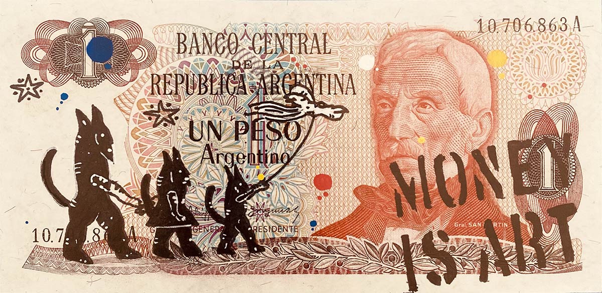 Tecnica mista (collage, pennarello Posca e acrilico) su banconota da 1 Peso Repubblica Argentina