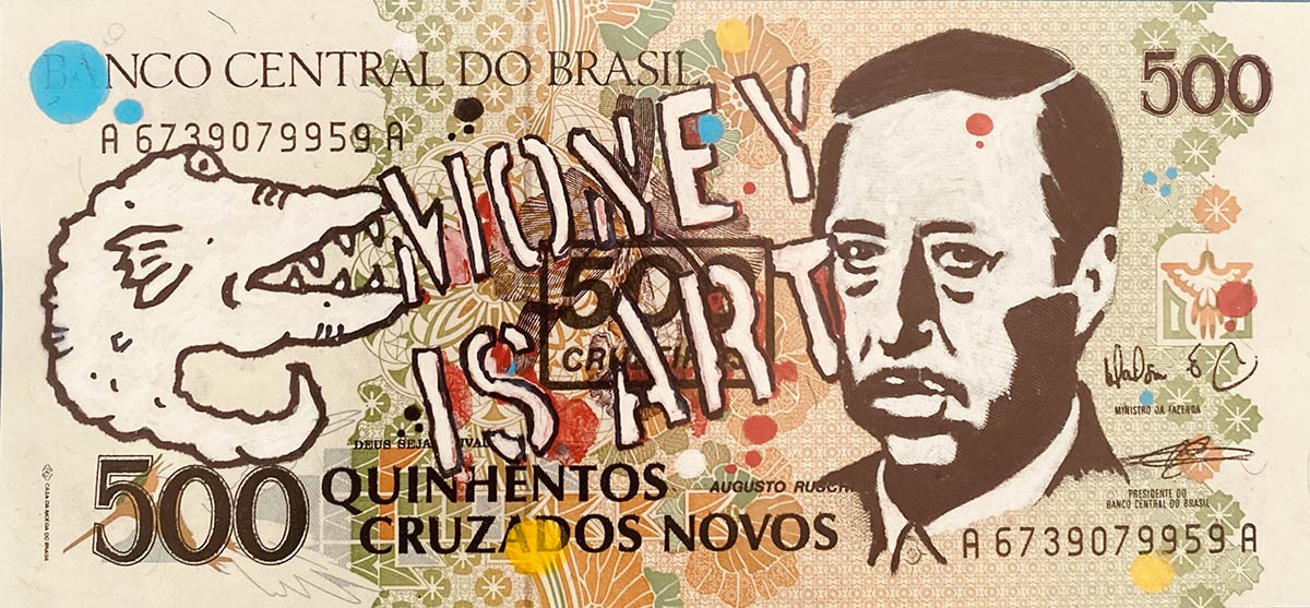 Tecnica mista (collage, pennarello Posca e acrilico) su banconota da 500 Cruzados Repubblica Federale del Brasile