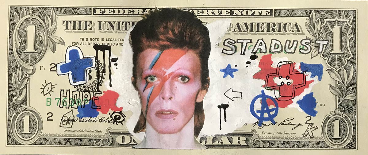 Tecnica mista (collage, pennarello Posca e acrilico) su banconota da 1 dollaro USA