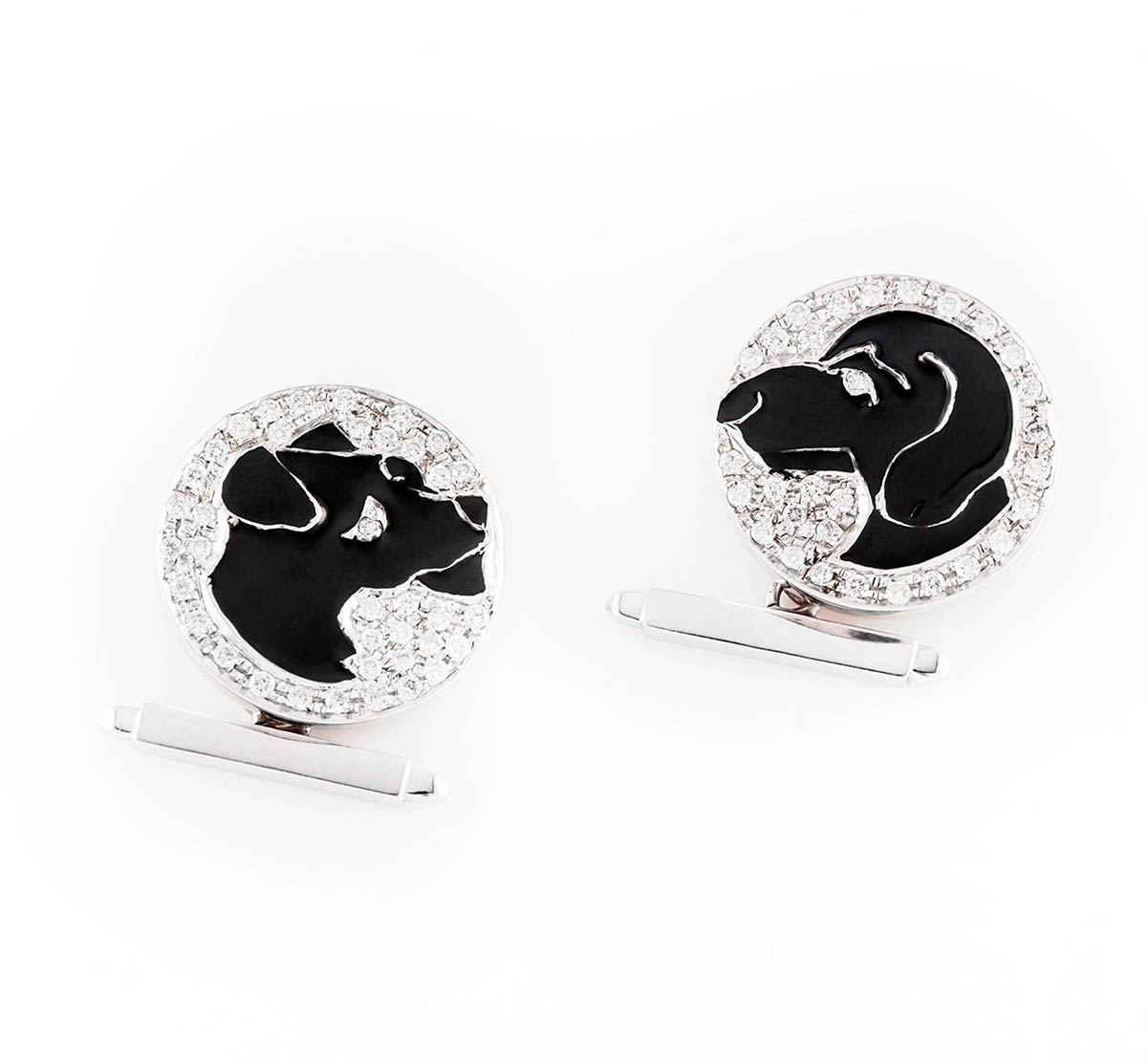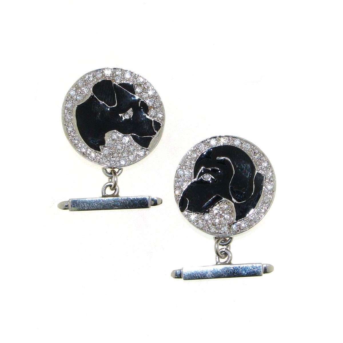 Gemelli artigianali realizzati in italia negli anni '60 in oro bianco K 18 e tempestati da brillanti di 2,20 ct. Al centro di ognuno vi è il profilo di un cane realizzato in smalto nero. Misura 19,8 mm, peso 15,28 gr.