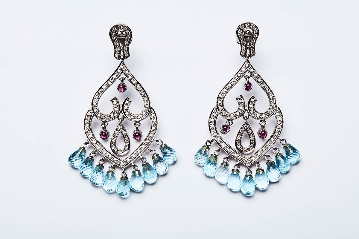 Coppia di orecchini artigianali realizzati in Italia negli anni '50 in oro bianco K 14. Entrambi realizzati con brillanti di 2 ct. Disposti su linee ondulate a formare due cuori contrarie, rubini di 0,60 ct. e acquamarine pendenti taglio briolet di 18 ct. Misure 62x30 mm, peso 21,14 gr.