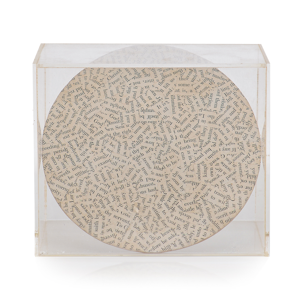 JIRI KOLAR Praga 24/09/1914 - Praga 11/08/2002 Senza titolo, 1986 collage su cartoncino circolare bifronte diametro cm. 18,2; entro teca in plexiglass cm. 11x18,8x15,8; dichiarazione d'autenticità dell'artista su foto.