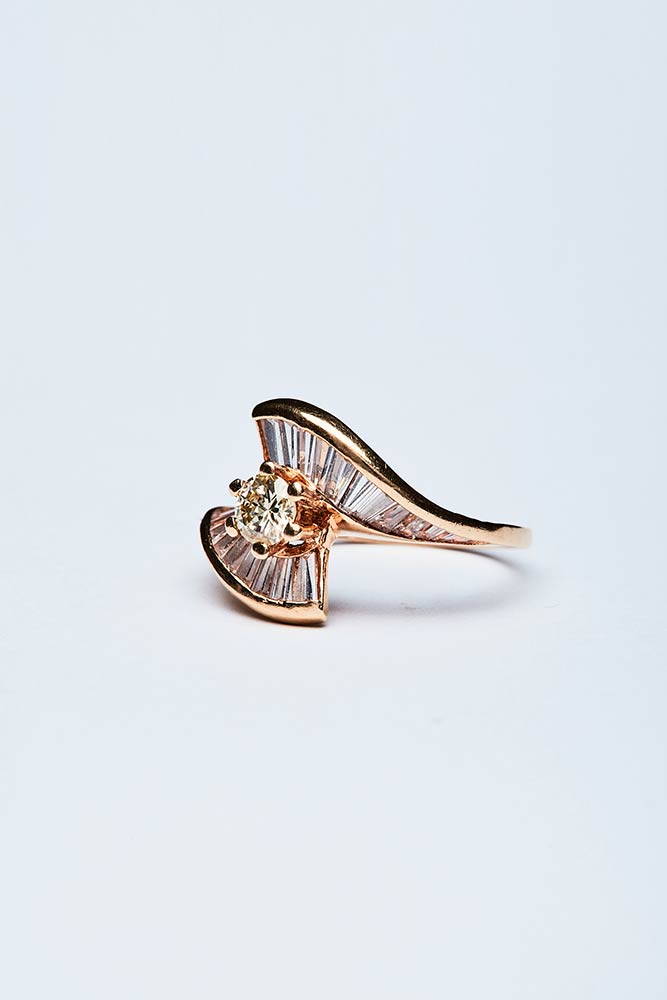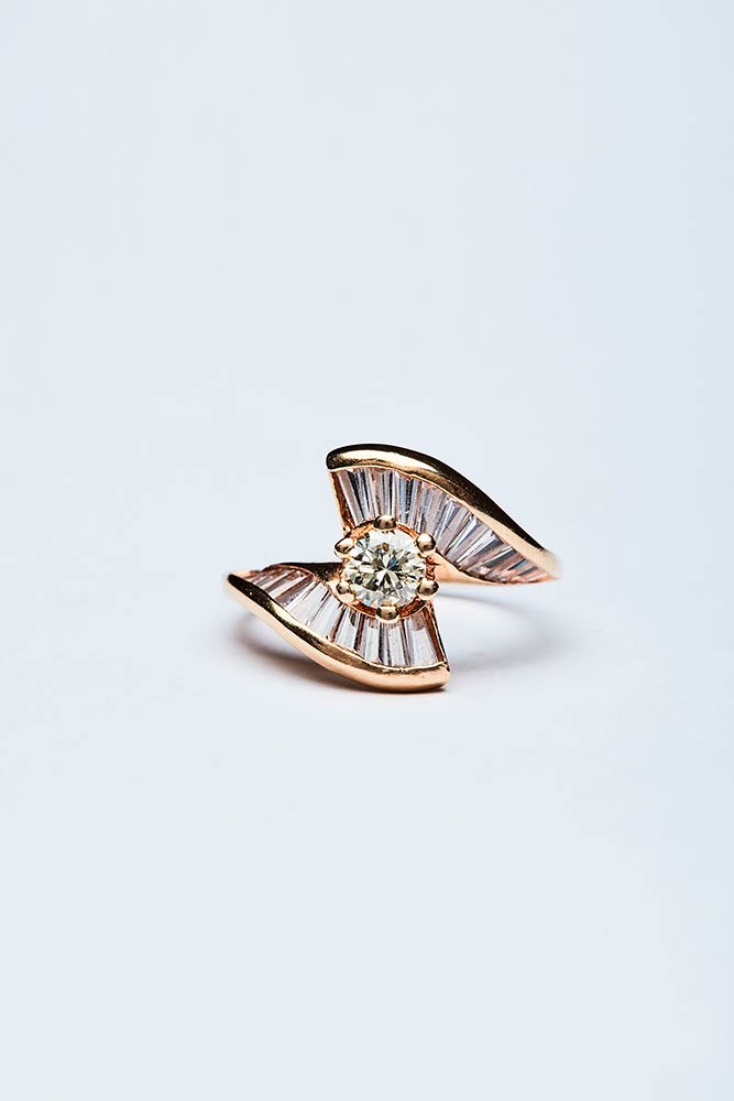 Anello artigianale realizzato in Italia negli anni '30 in oro giallo K 18. A forma di fiocco dai lembi sinuosi con incastonati diamanti a baguette di 1,50 ct e, brillante centrale di 0,30 ct. Misura IT 11, 14,18x19,58 mm; peso 3,48 gr.