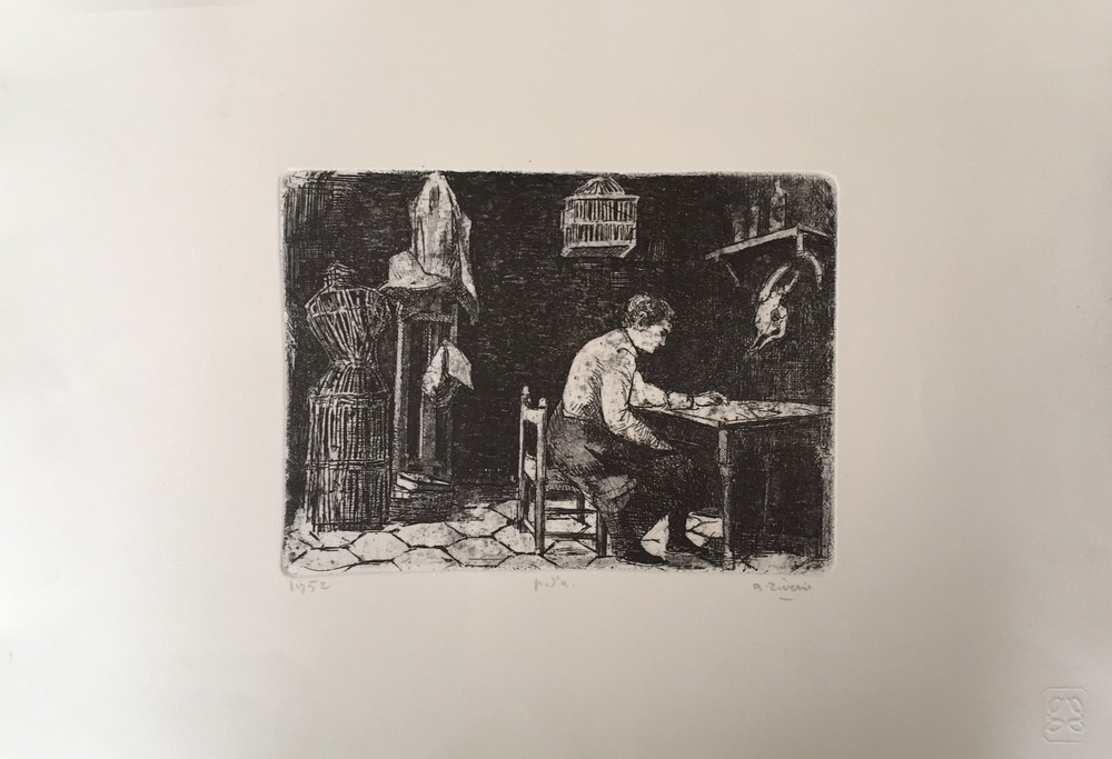 Firma, data e tiratura in basso sul foglio: A. Ziveri, 1952, p. d'a; "Ziveri. Le incisioni. Catalogo generale", a cura di Netta Vespignani, Roma, De Luca Editore, n° 513, p. 229