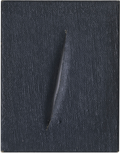 LUCIO FONTANA 1899 - 1968 CONCETTO SPAZIALE. ATTESA signed, titled and dated 1959 on the reverse, varnish on canvas firmato, intitolato e datato 1959 sul retro vernice su tela cm 10x8 PROVENANCE Studio Condotti 85, Roma Collezione Giorgio De Dominicis, Roma Ivi acquistato dall'attuale proprietario LETTERATURA E. Crispolti, Lucio Fontana. Catalogo ragionato di scultura, dipinti, ambientazioni, Milano 2006. vol. I, pag. 480, n. 59 T 183, illustrato