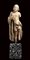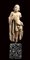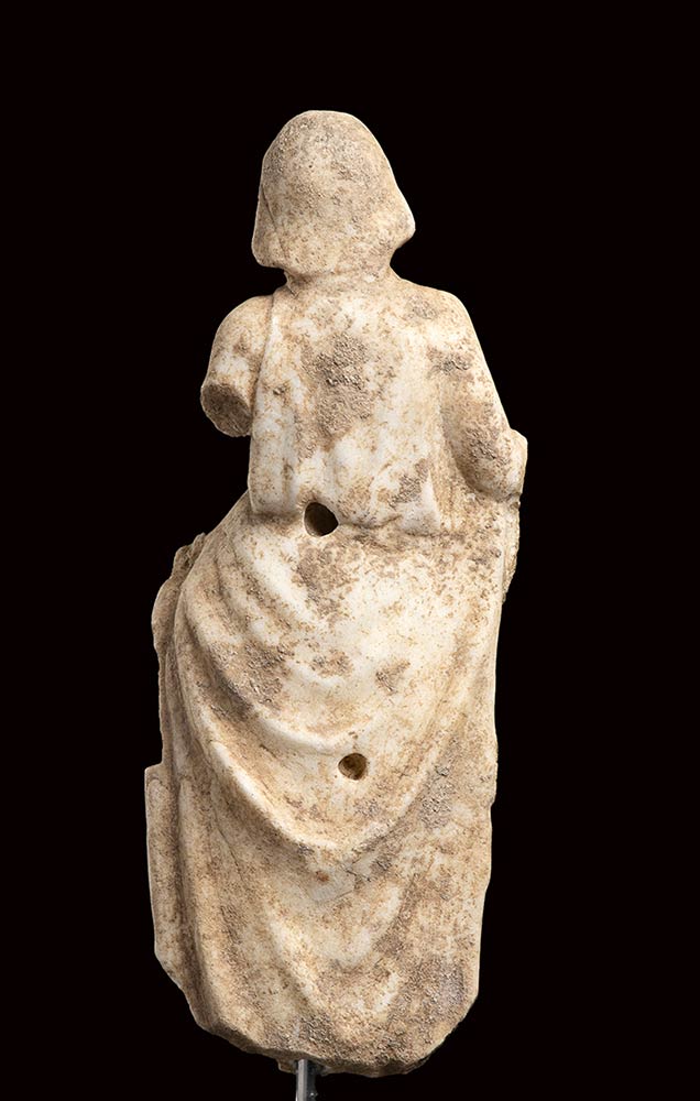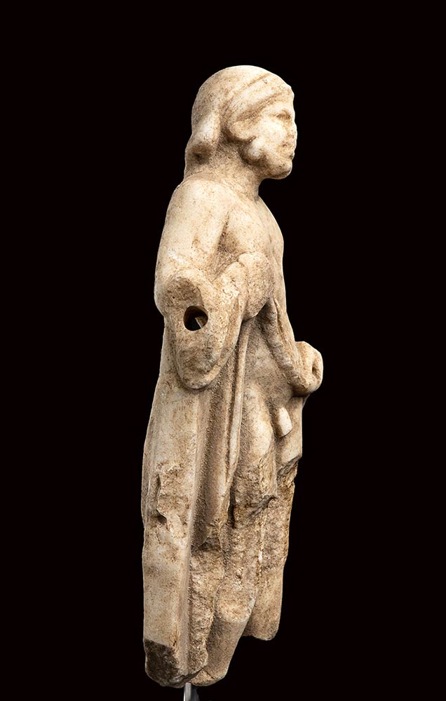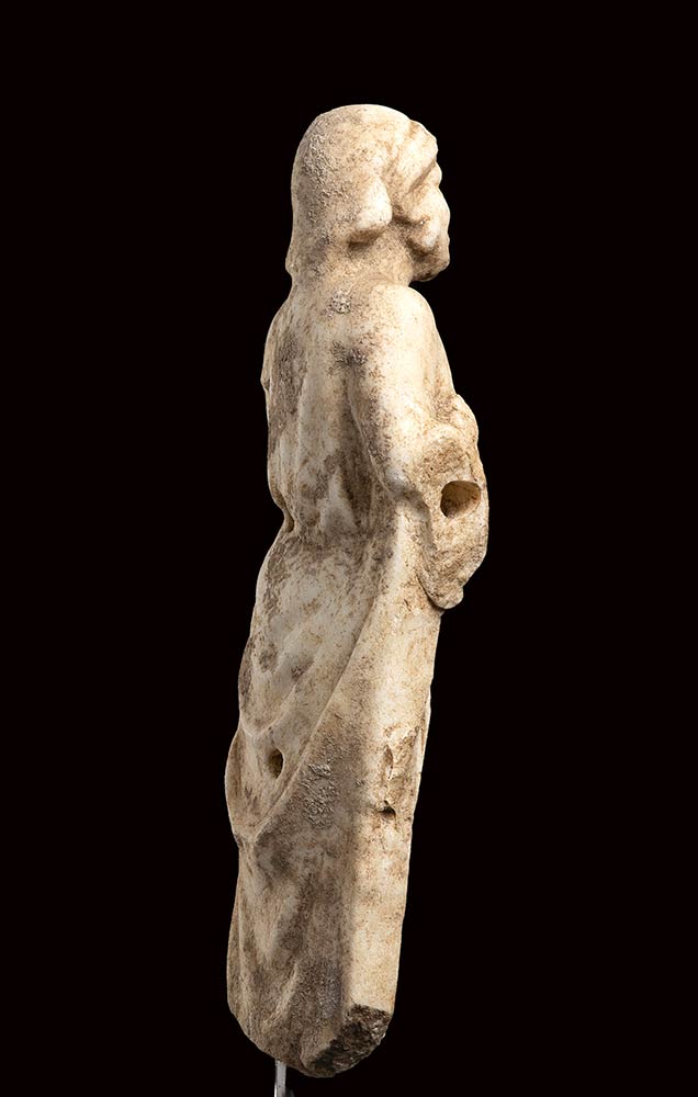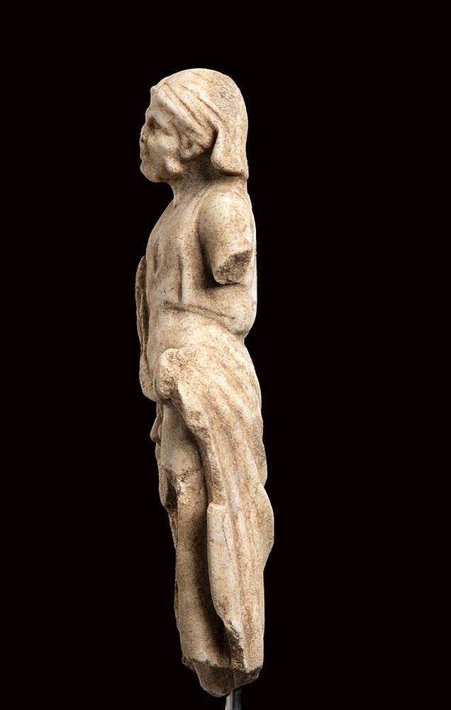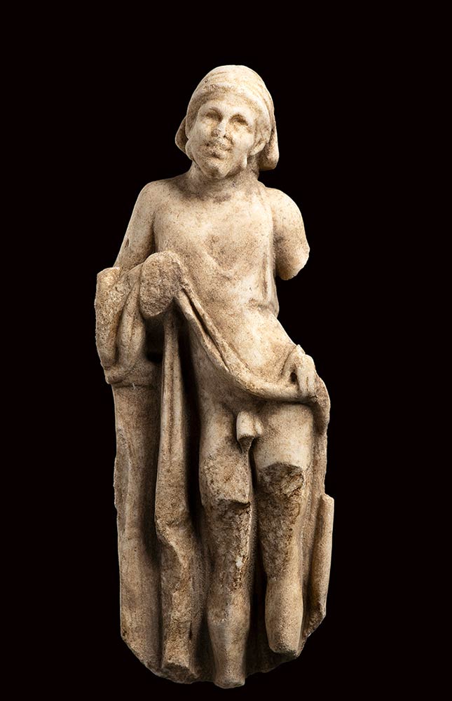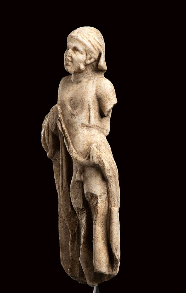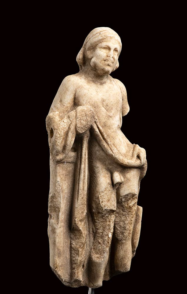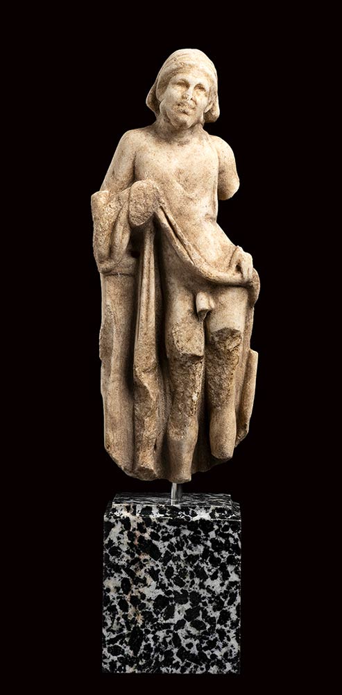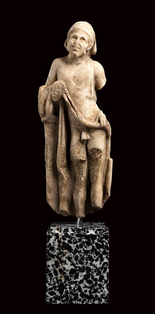 Greek Hellenistic Marble Grottesque Figure, 2nd - 1st century BC; height cm 24; Depicted standing, resting on a pillar, in the act of lifting the robe, discovering the genitals; the head is wrapped in a drape and a flap-like extensions beneath the chin representing a cock’s wattle. Provenance: Private collection, London, acquired 1960s - 1980s.