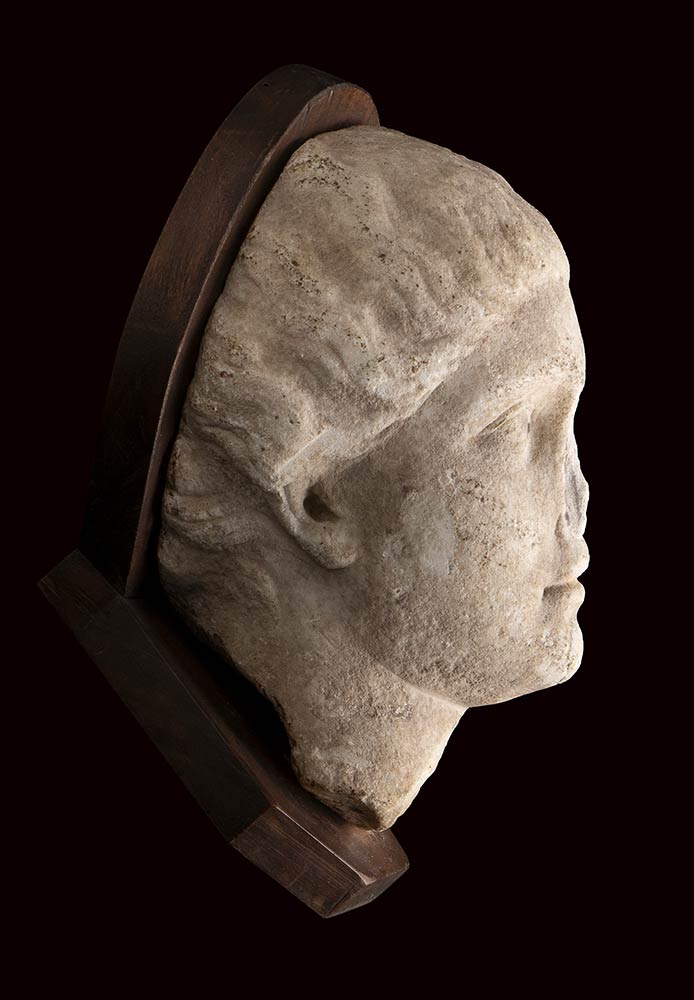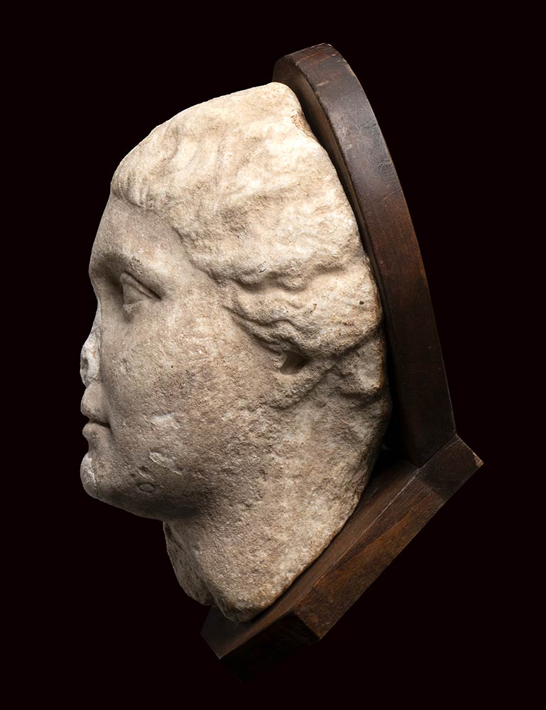 Roman Marble Head of a Woman, 1st century BC - 1st century AD; height (with wooden support) cm 16,8; height cm 21. An elegant head in high relief depicting a young woman or a goddess, with the hair arranged in curly locks. Plasterwork restorations on nose and chin. Provenance: English private collection, according to the heirs possibly purchased in some auction or Art Gallery during 1970s-1980s.