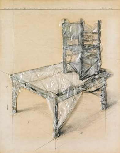 CHRISTO B.1935 TWO PACKED CHAIRS AND TABLE (PROJECT FOR HOLLAND - SPECTRUM FACTORY BERGOYK) signed, titled and dated 1965, pencil, pastels, pack-thread, plastic and paper clips on cardboard.This work is registered by Christo and Jeanne-Claude Archive, curated by Galerie Daniel Varenne, Geneve, and it will be published on the forthcoming Catalogue Raisonné firmato, intitolato e datato 1965 matita, pastelli, spago, plastica e graffette su cartoncino cm 72x57 Opera registrata presso il Christo and Jeanne-Claude Archive, a cura della Galerie Daniel Varenne, Ginevra, con il n. 16648 L'opera sarà pubblicata sul Catalogo Ragionato di prossima pubblicazione, a cura della Galerie Daniel Varenne, Ginevra