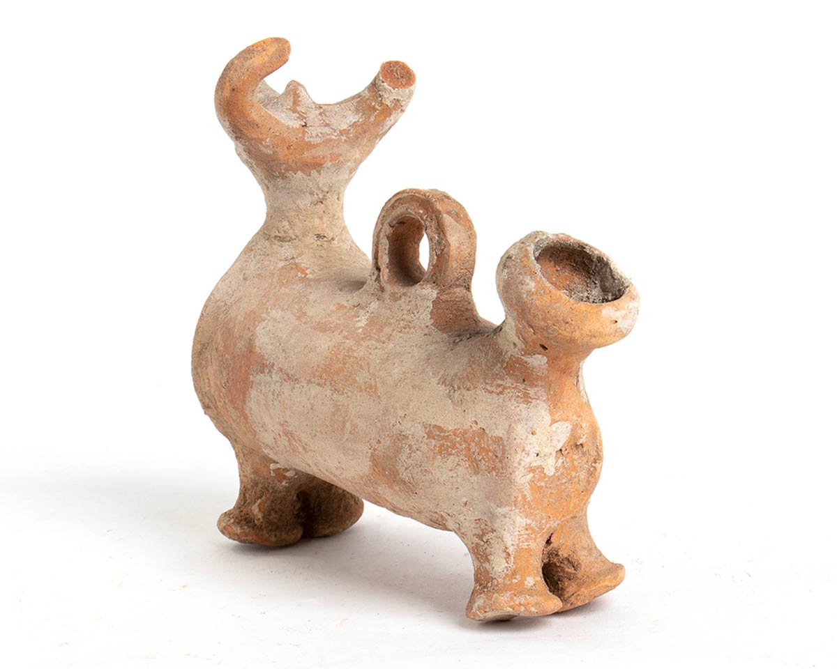 Iranian Amlash Culture Bull-Shaped Askos, 9th - 8th century BC; height cm 12,5, length cm 15; Modeled as a standing bull characterized by a cylindrical body, with four stocky feet, a small loop handle centered on the back and the spout on the rear side. Provenance: English private collection, according to the heirs possibly purchased in some auction or Art Gallery during 1970s-1980s.