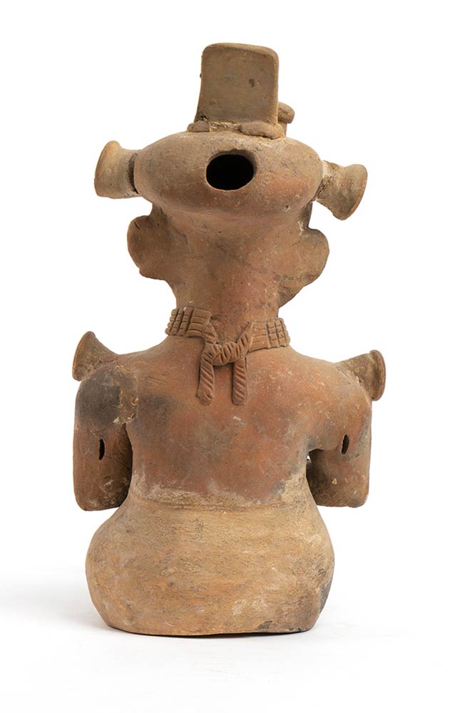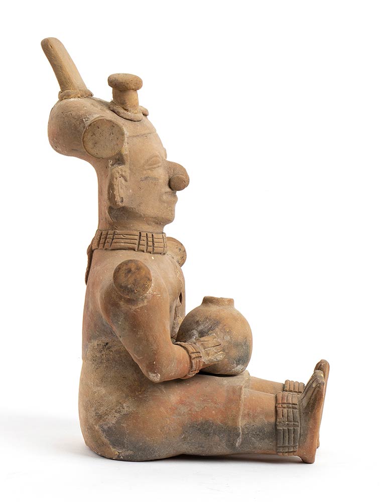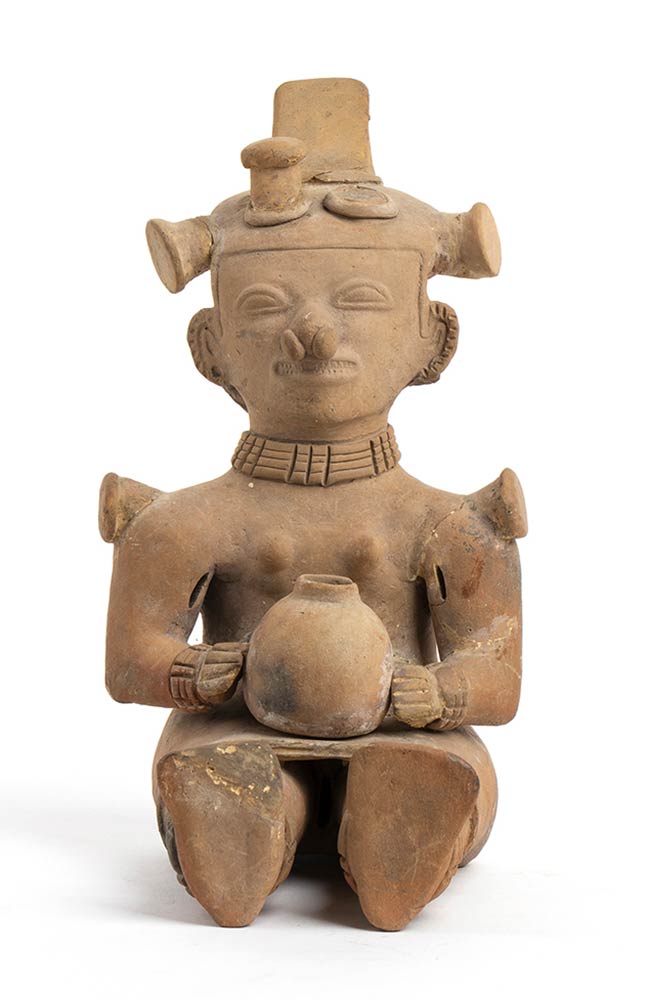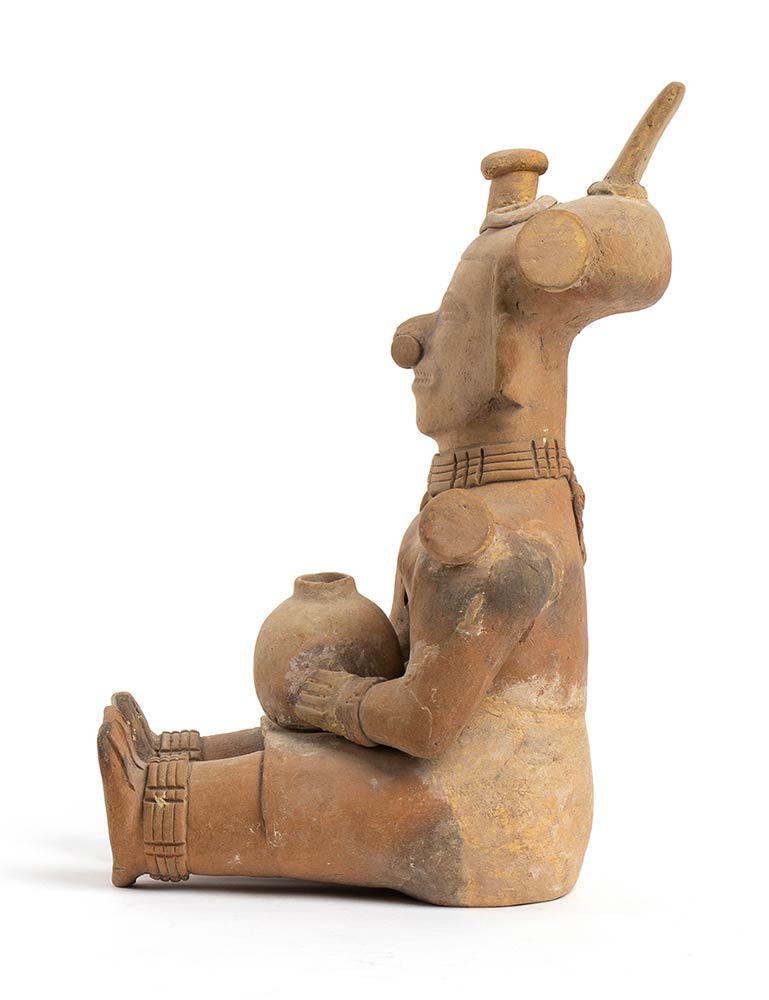 Terracotta Seated Female Statuette holding Jar, Ecuador, Jama-Coaque Culture, ca. 6th - 12 century AD; height cm 25,4. Scattered restorations and a missing horn. Provenance: From an Italian collection formed during 1970s - 1990s; this lot require the Italian export licence (please contact the auction house about info and additional cost).