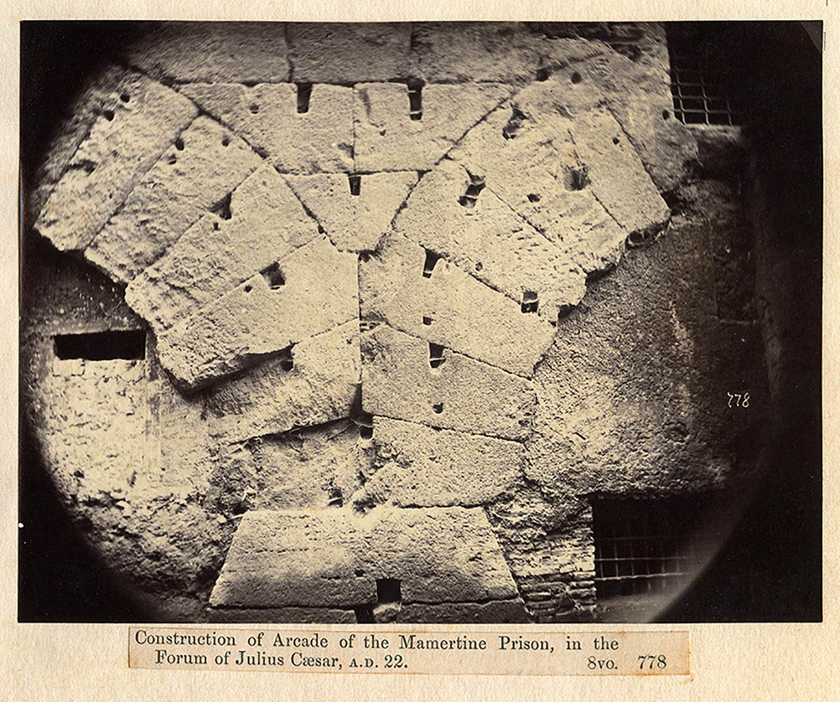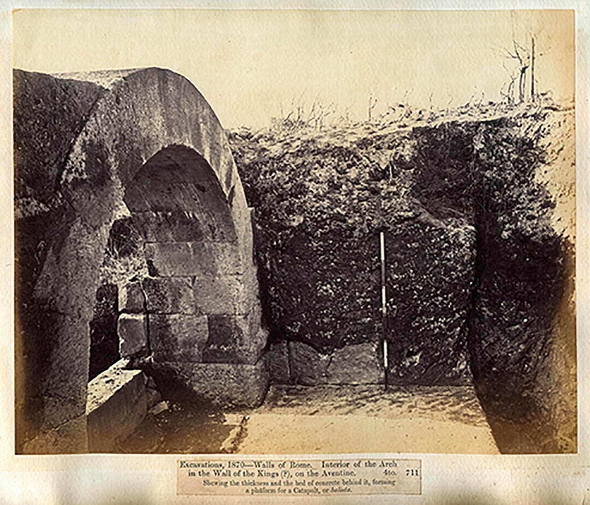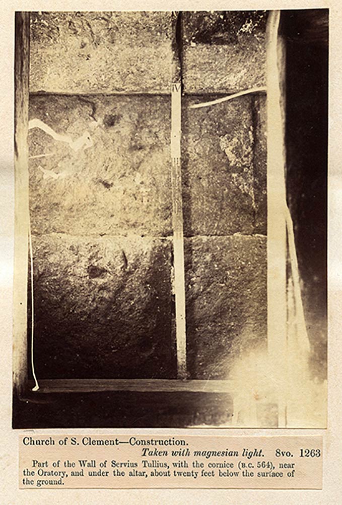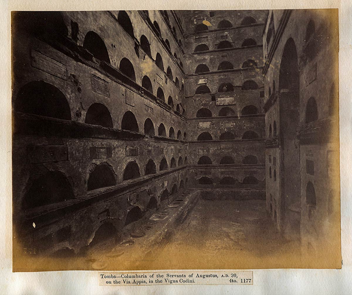 Collection of 43 photographs of Rome and its Antiquities taken and collected by John Henry Parker, 1865-1877; various sizes, pages cm 30,5 x 47; Photographs taken by John Parker and Charles Smeaton who experimented the use of artificial light sources (magnesium). Albumin and salt paper prints applied to light cardboard pages. In the photos some classical and early Christian monuments, architectural details, archaeological excavations and the very rare images taken inside the interior of crypts and catacombs. On the whole there are some prints made by the circle of Parker (Simelli, Lais, Colamedici) during the period of collaboration with Rodolfo Lanciani. The innovative insertion of metric references in the images is very interesting.