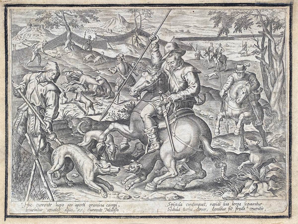 Scena di caccia, al centro un cavaliere con lancia cerca di colpire un lupo, altri cacciatori a cavallo e a piedi attorno, sullo sfondo delle reti per catturare gli animali.