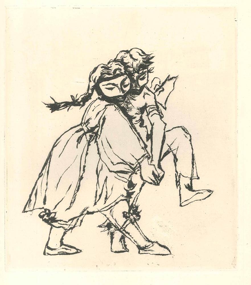 Questa stampa originale, raffigurante due bambini mascherati che ballano, è firmata a matita sul margine inferiore destro, con titolo e note autografe.