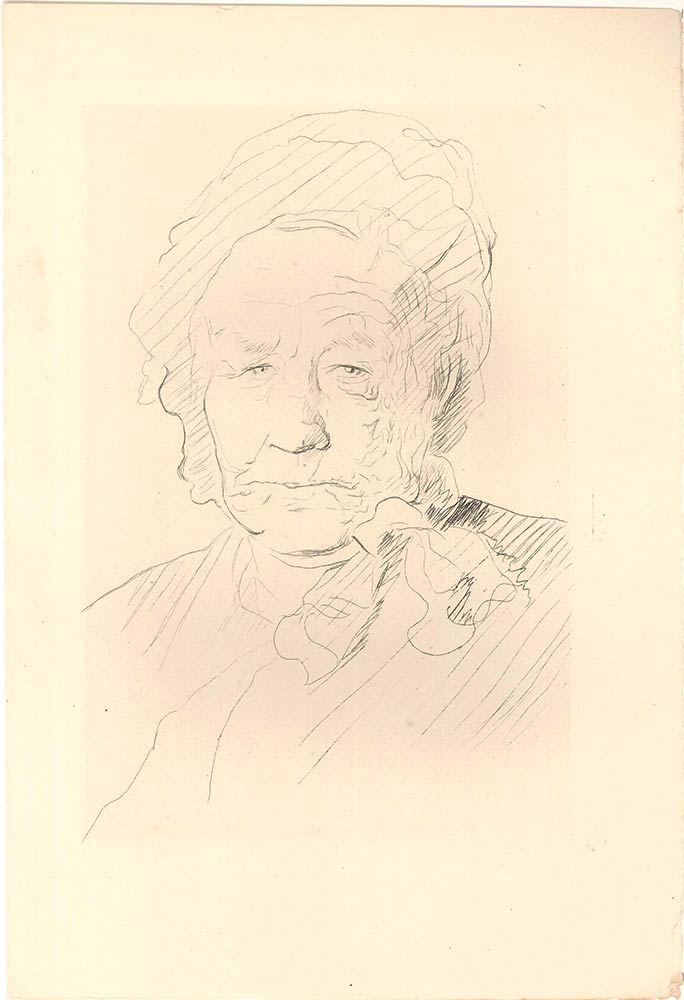 Tête de femme agée è un punto secco su carta vergata, che rappresenta un bellissimo ritratto di una donna anziana, realizzato da Jeanne Bardey.
