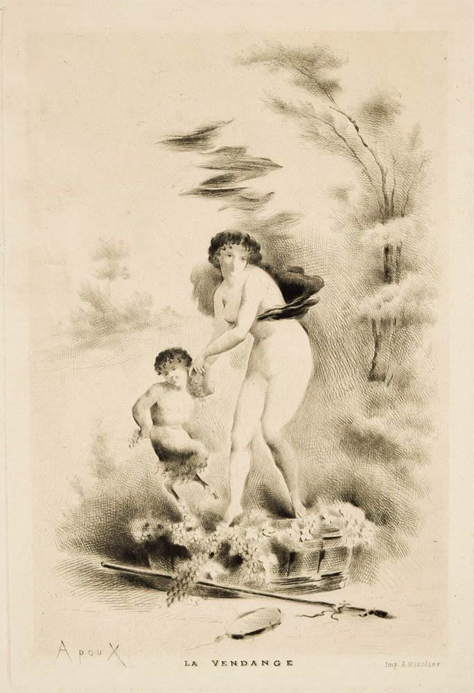 La Vendange è un'incisione in bianco e nero, punta secca e acquatinta su carta vergata, realizzata tra la fine del XIX e l'inizio del XX secolo, dall'artista francese Joseph Apoux (1846-1910).