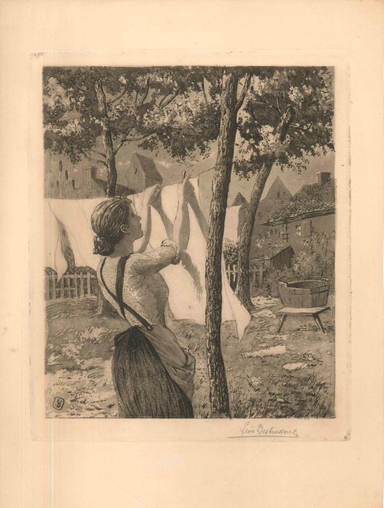 Woman Hanging Laundry è un bellissimo acquatinta in bianco e nero e incisione su carta color avorio, realizzata nel 1904 dall'artista francese Léon Desbuissons (1870-1940).